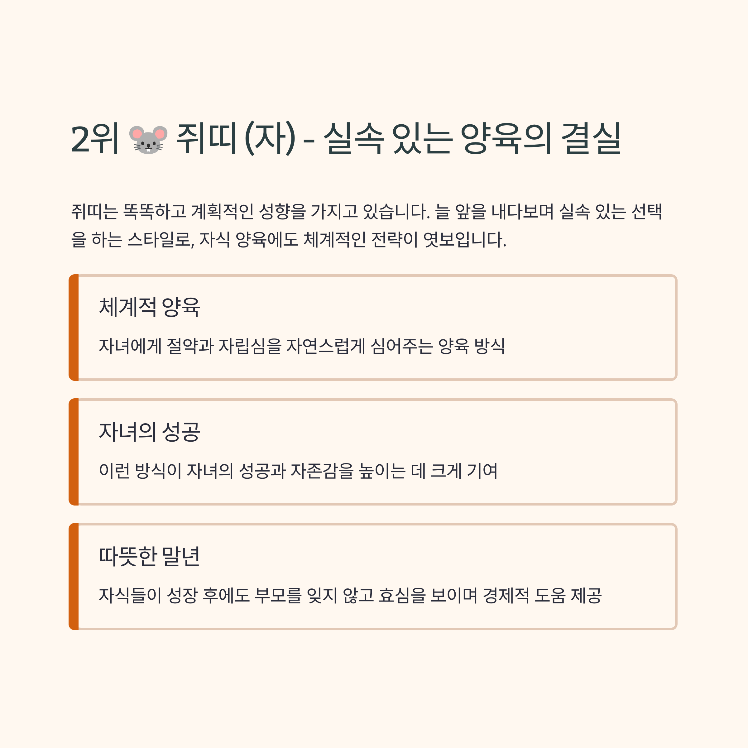 쥐띠는 똑똑하고 계획적인 성향을 가지고 있습니다. 늘 앞을 내다보며 실속 있는 선택을 하는 스타일이기 때문에, 자식 양육에도 체계적인 전략이 엿보입니다. 쥐띠 부모는 자녀에게 절약과 자립심을 자연스럽게 심어주는 경우가 많고, 이런 방식이 자녀의 성공과 자존감을 높이는 데 크게 기여합니다. 자식들이 성장 후에도 부모를 잊지 않고 효심을 보이며, 경제적으로 도움을 주는 경우도 많아 ‘말년이 따뜻한 띠’ 중 하나로 손꼽힙니다.