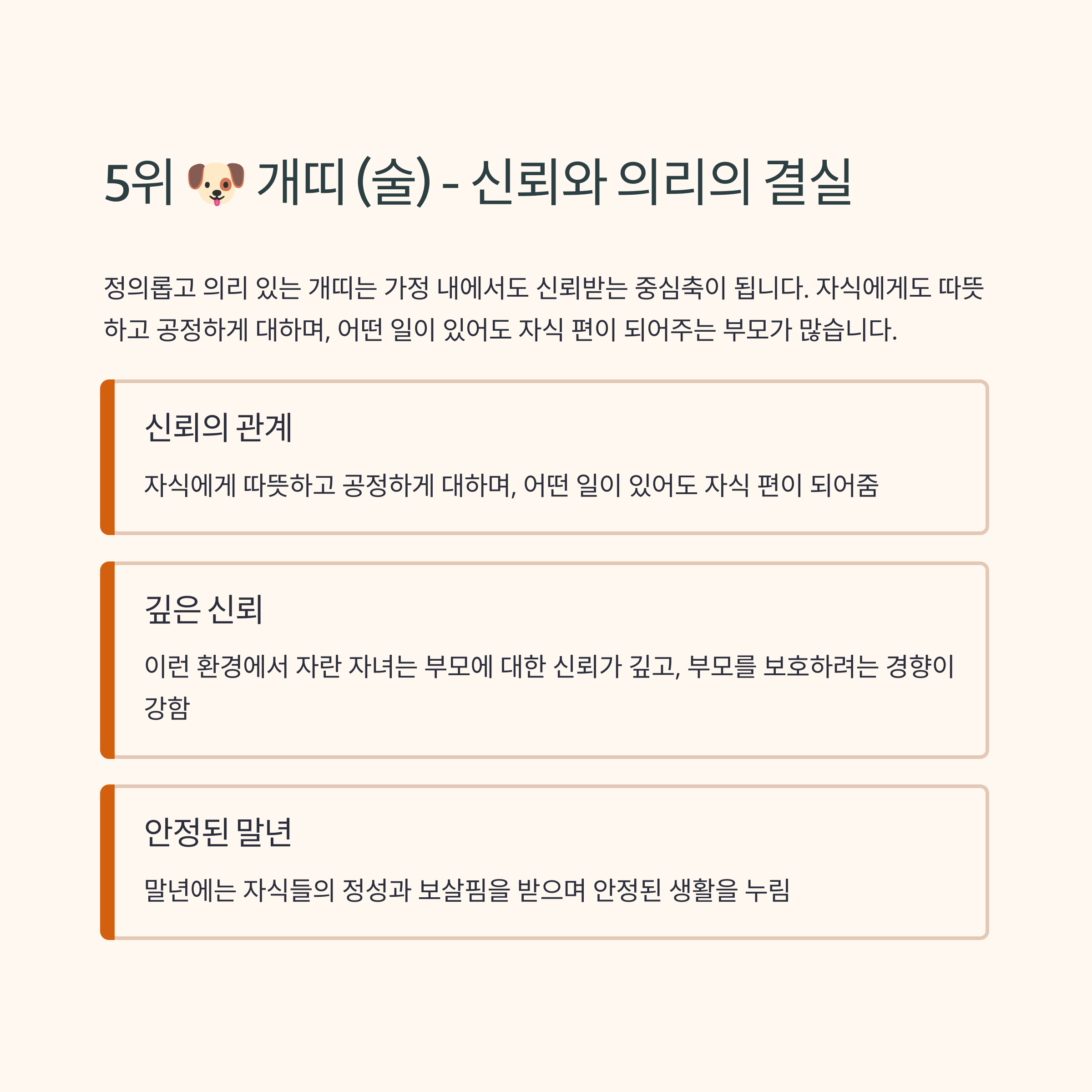정의롭고 의리 있는 개띠는 가정 내에서도 신뢰받는 중심축이 됩니다. 자식에게도 따뜻하고 공정하게 대하며, 어떤 일이 있어도 자식 편이 되어주는 부모가 많습니다. 이런 환경 속에서 자란 자녀는 부모에 대한 신뢰가 깊고, 커서도 부모를 보호하고 지키려는 경향이 강합니다. 개띠는 인간관계에서도 좋은 평가를 받기 때문에, 자식 또한 사회생활에서 좋은 본보기를 따르며 성장합니다. 결국 말년에는 자식들의 정성과 보살핌을 받으며 안정된 생활을 누리는 경우가 많습니다.