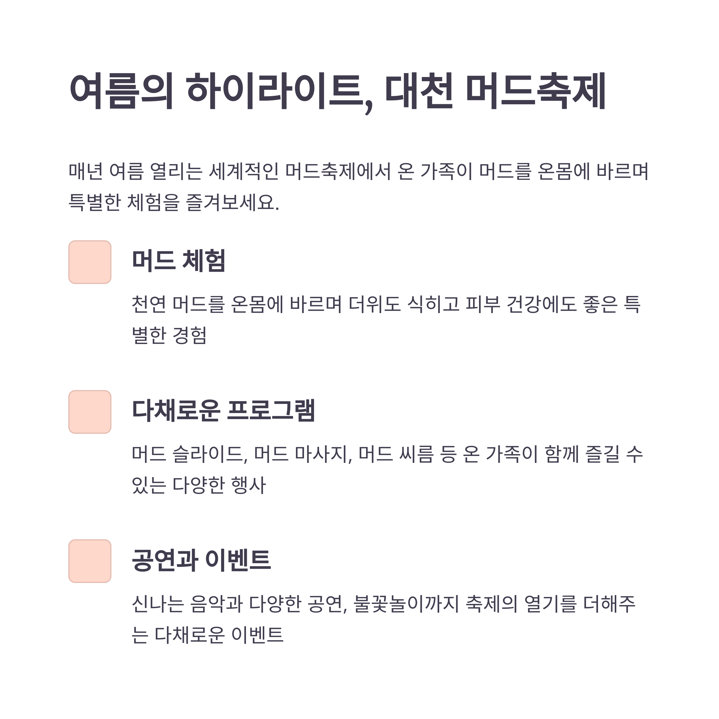 여름에는 대천 머드축제가 열려 전 국민의 축제 분위기를 만끽할 수 있습니다. 가족들이 함께 머드 체험을 하며 더위를 식히고 즐거운 추억을 쌓기에 안성맞춤입니다. 머드 축제 기간에는 다양한 공연과 이벤트가 함께 진행되어 아이부터 어른까지 모두 즐길 수 있는 다채로운 프로그램이 마련됩니다.