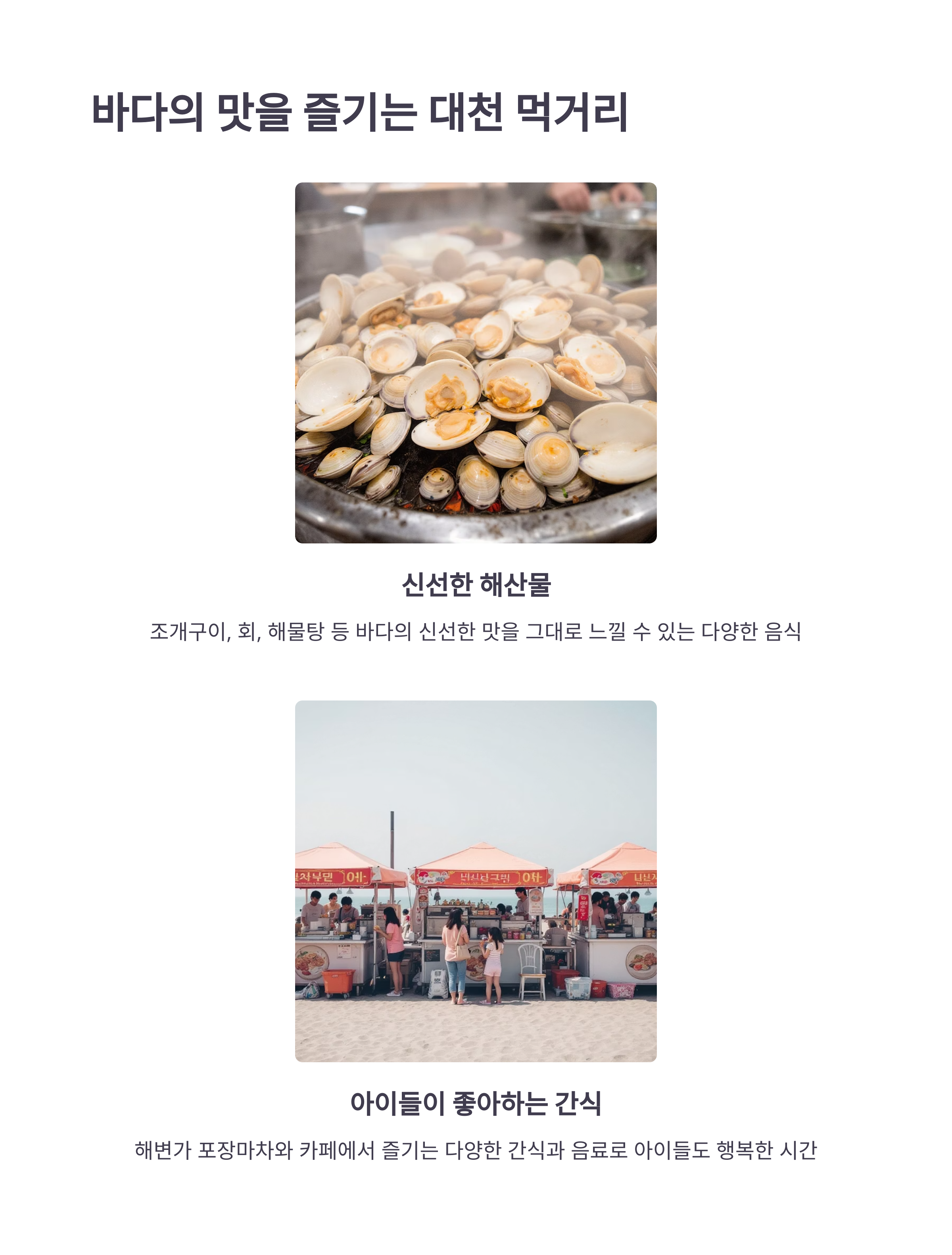 특히 대천 해수욕장은 접근성도 좋아 대중교통이나 자가용 모두 편리하게 이용할 수 있어 가족 여행 계획에 부담이 없습니다. 계절에 따라 다양한 즐길거리와 축제가 있어 방문할 때마다 새로운 즐거움을 선사합니다. 대천 해수욕장에서 가족과 함께하는 추억은 오래도록 기억에 남을 것입니다.