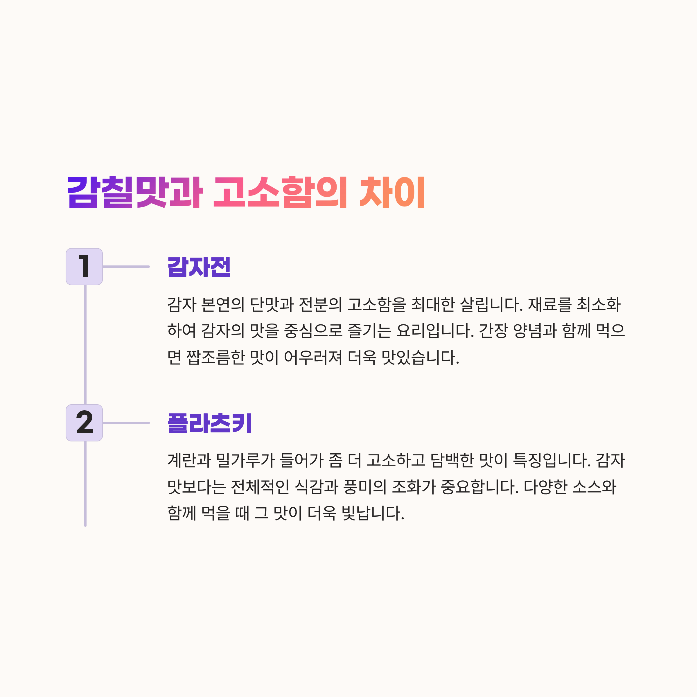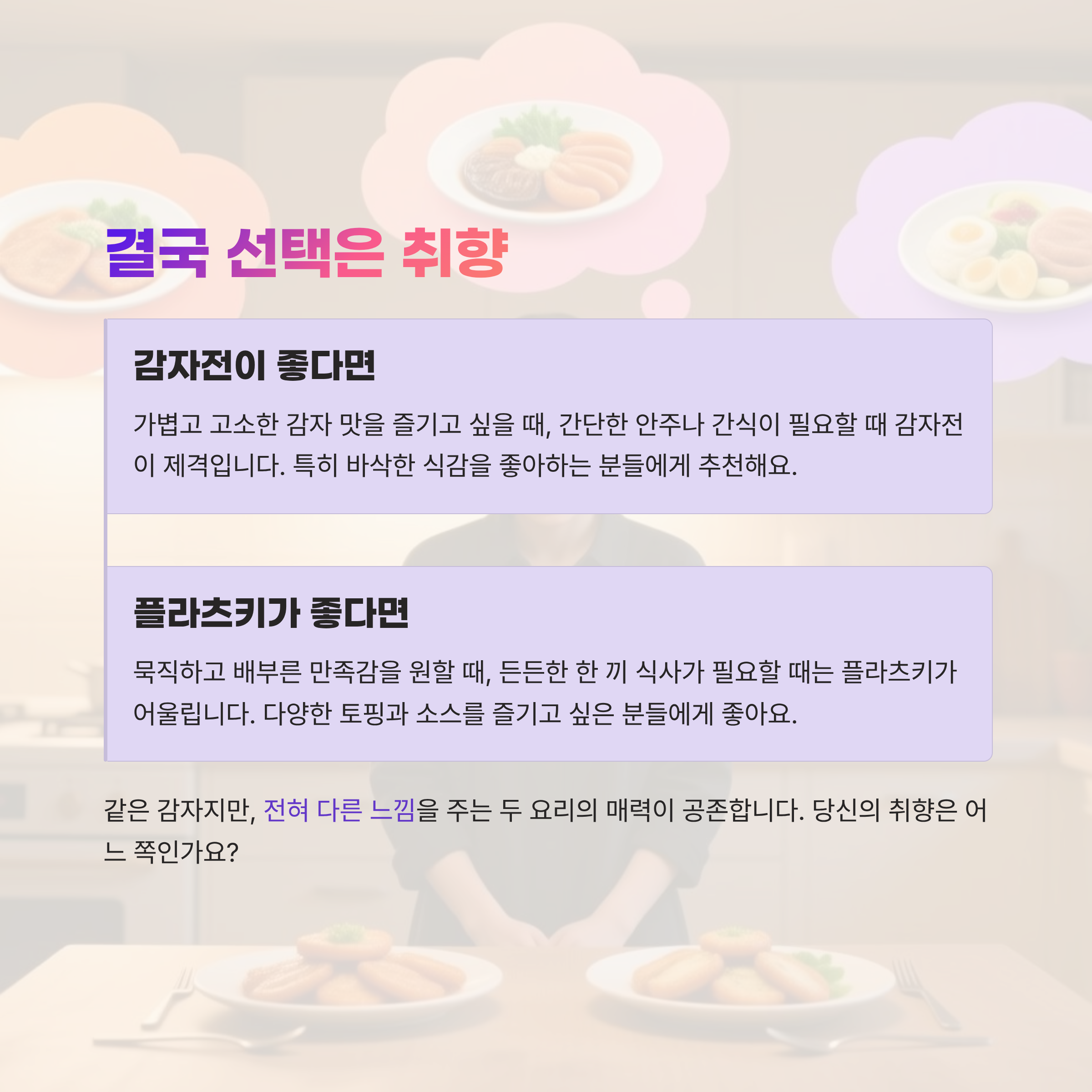 가볍고 고소한 감자 맛을 즐기고 싶다면 감자전, 묵직하고 배부른 만족감을 원한다면 플라츠키가 어울립니다. 같은 감자지만, 전혀 다른 느낌을 주는 두 요리의 매력이 공존합니다.