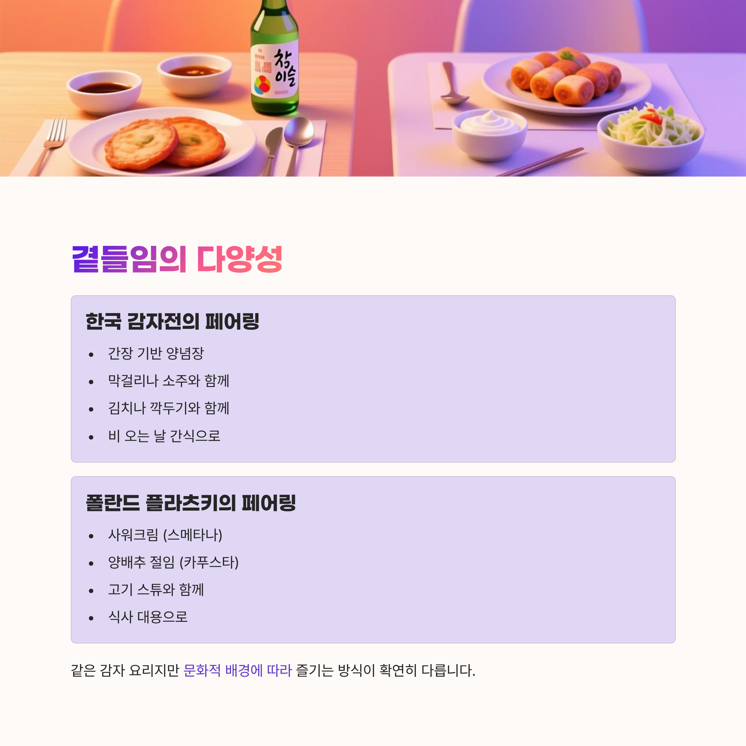 한국의 감자전은 간장 양념장이나 막걸리와 함께 즐기는 경우가 많습니다. 반면 폴란드 플라츠키는 사워크림, 양배추절임, 혹은 고기 스튜와 곁들이며 한 끼 식사로도 손색이 없습니다.