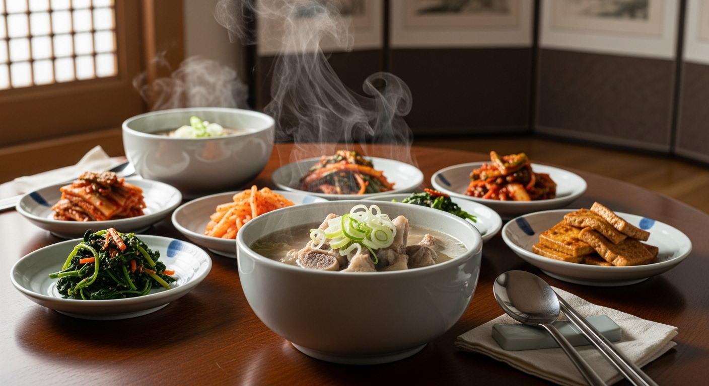 곰탕은 소의 다양한 부위(사태, 양지, 갈비 등)를 장시간 푹 끓여낸 우리나라 전통 국물 요리입니다. '곰'은 '고다(끓이다)'의 옛말로, 오랫동안 끓인다는 뜻을 담고 있습니다.