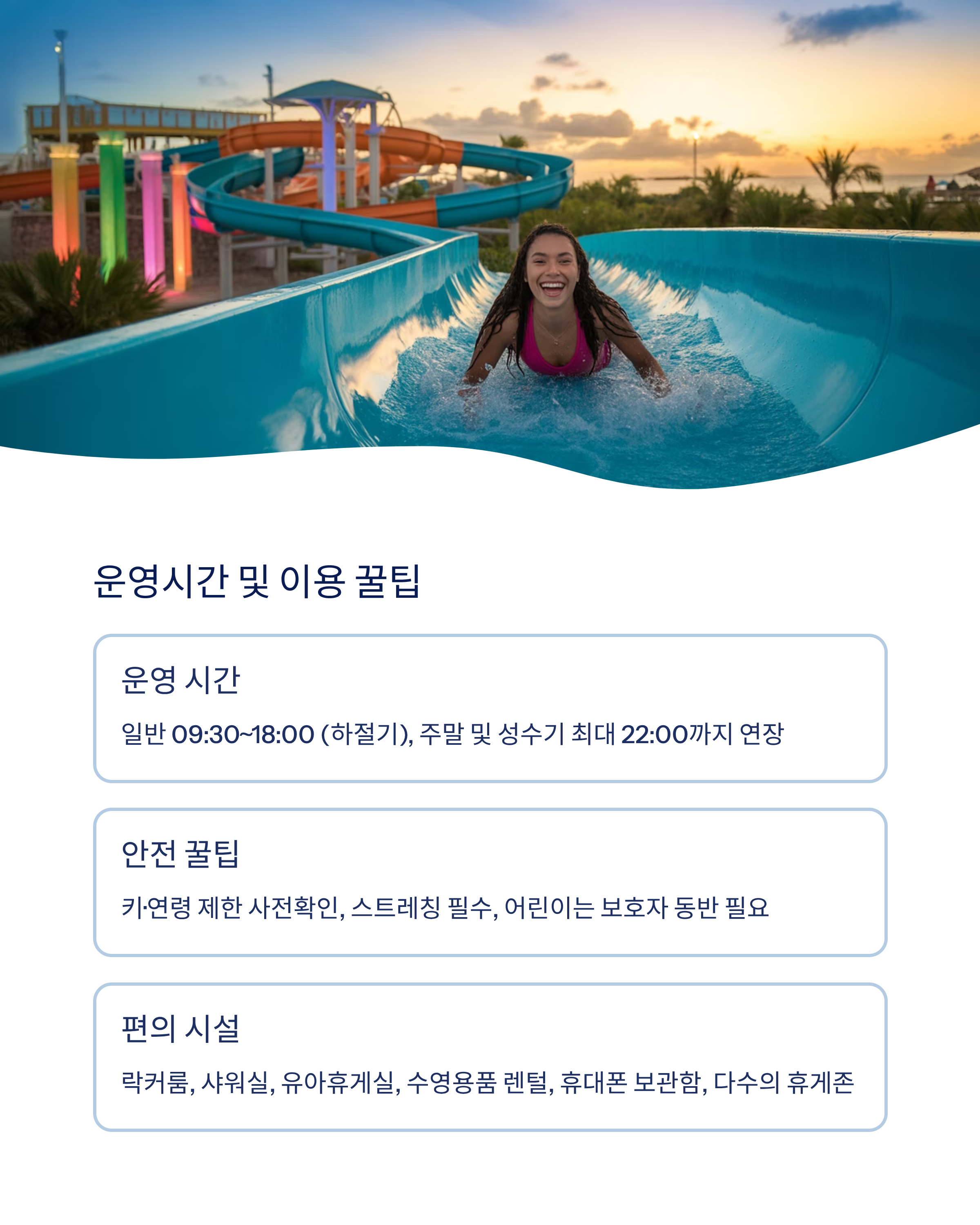 - 워터파크 내 모든 탑승시설은 키·연령 제한이 있어 사전 확인 필수.