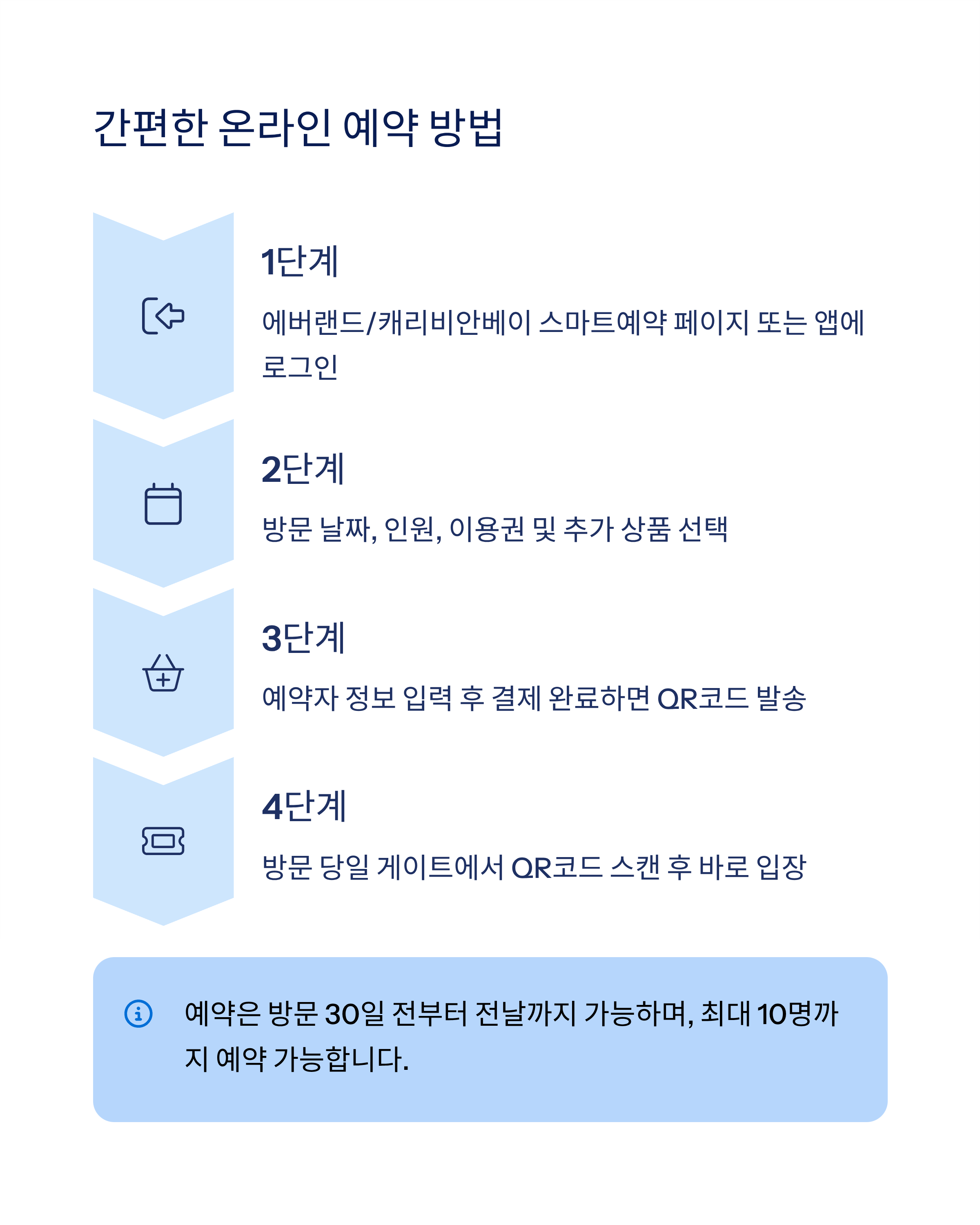 - 캐리비안 베이는 공식 홈페이지 또는 에버랜드 스마트예약 사이트와 앱에서 간편하게 온라인 예약이 가능합니다.