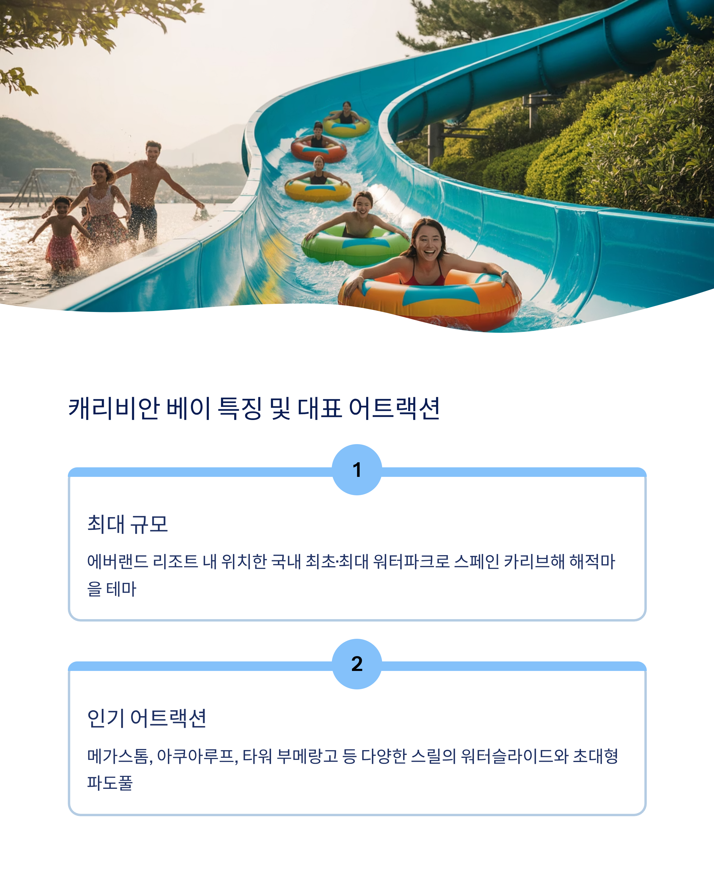 캐리비안 베이는 국내 최초·최대 규모의 워터파크로, 에버랜드 리조트 내에 위치해 있습니다. 스페인 카리브 해적 마을을 모티브로 남녀노소 모두 즐길 수 있는 다양한 물놀이 시설과 휴식 공간을 갖추고 있어 여름마다 수많은 관광객이 방문합니다. 대표 놀이기구로는 초대형 파도풀, 다양한 스릴의 워터 슬라이드(메가스톰, 아쿠아루프, 타워 부메랑고 등), 유수풀, 실내 파도풀, 키즈풀 등이 있습니다. '메가스톰'은 탑승 인원이 많고, 거대한 원통 슬라이드를 회전하며 내려오는 체험으로 스릴을 느낄 수 있습니다.
