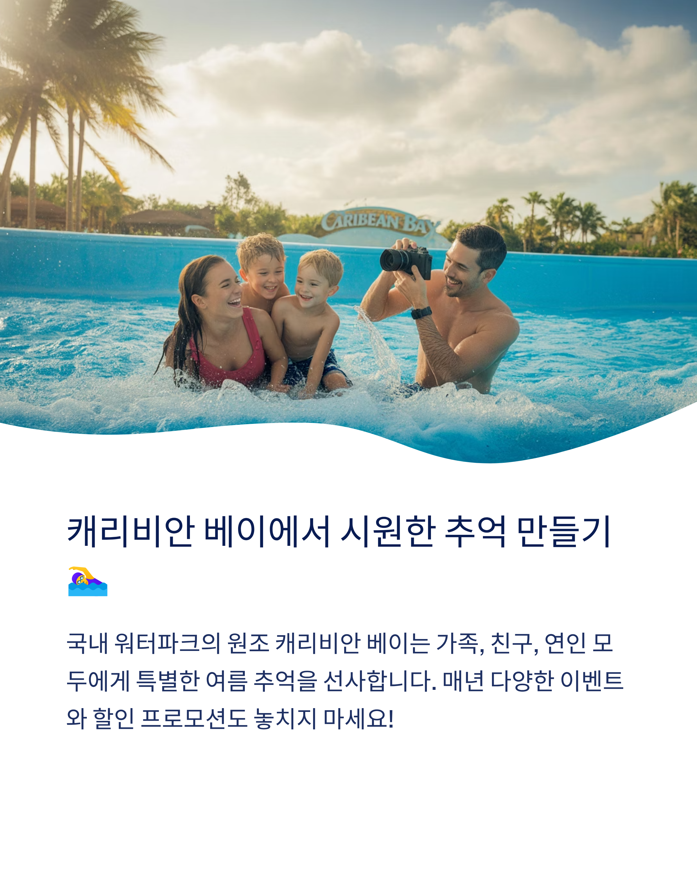 캐리비안 베이는 국내 워터파크의 원조답게, 가족 단위 방문객은 물론 친구, 연인 등 남녀노소 모두에게 특별한 여름 추억을 선사하는 공간입니다. 실내·외 구분 없이 다채로운 물놀이는 물론, 안전관리와 위생에 각별히 신경 쓰고 있어 처음 방문하는 분들도 안심하고 쾌적하게 이용할 수 있습니다. 또한 매년 시즌별 행사와 프로모션, 다양한 할인 이벤트가 열려 경제적으로도 만족감을 높여줍니다. 편리한 교통과 숙박 연계 서비스까지, 하루종일 신나고 시원하게 놀 수 있는 국내 대표 워터파크를 찾는다면 캐리비안 베이를 적극 추천합니다.