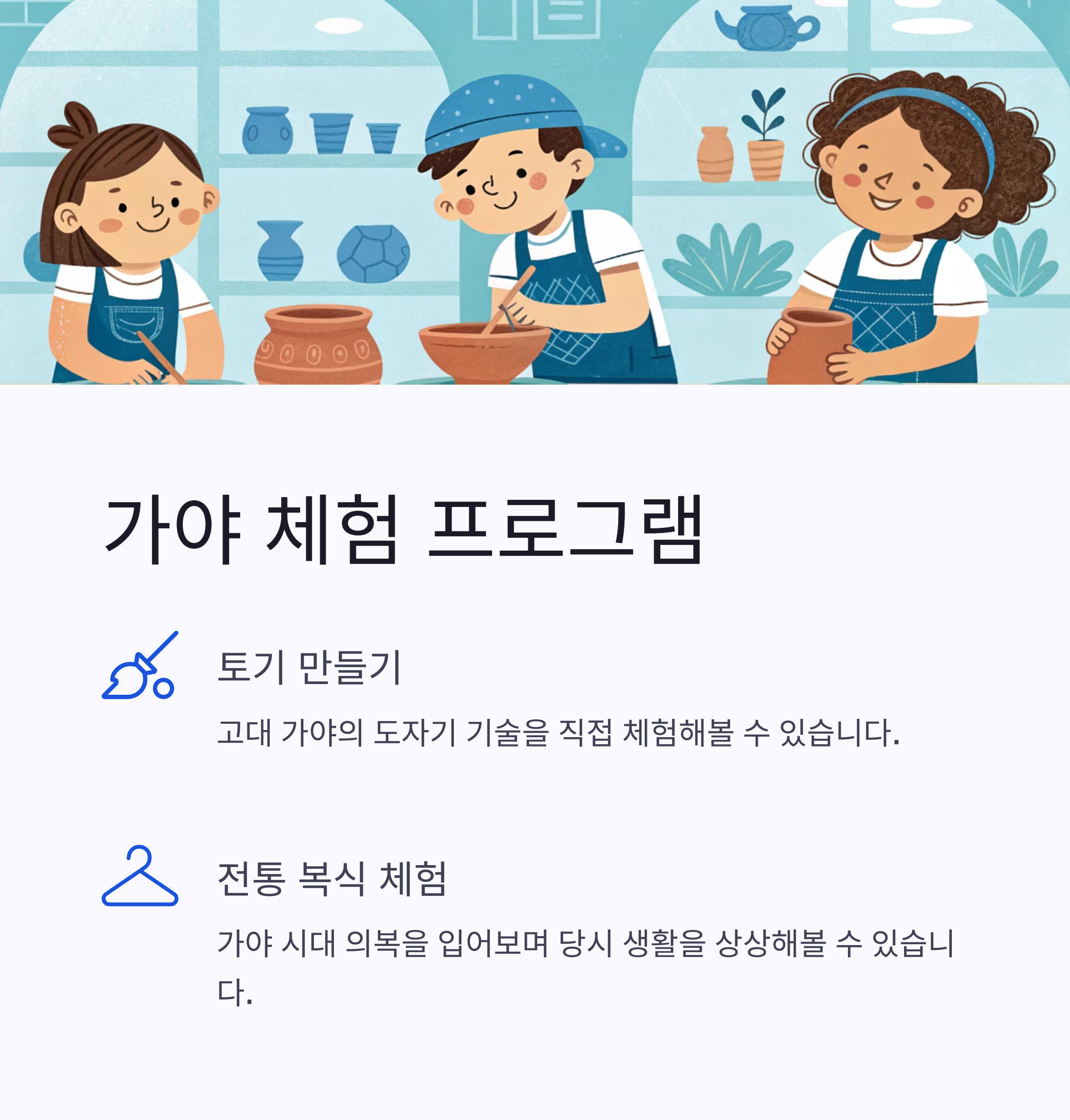 토기 만들기, 가야 전통 복식 입어보기, 장신구 착용 체험 등 실제 고대 가야인의 문화를 직접 체험할 수 있는 프로그램도 다양하게 마련되어 있습니다. 역사를 단순히 배우는 것이 아니라, 오감으로 경험함으로써 오래 기억에 남는 여행이 됩니다.