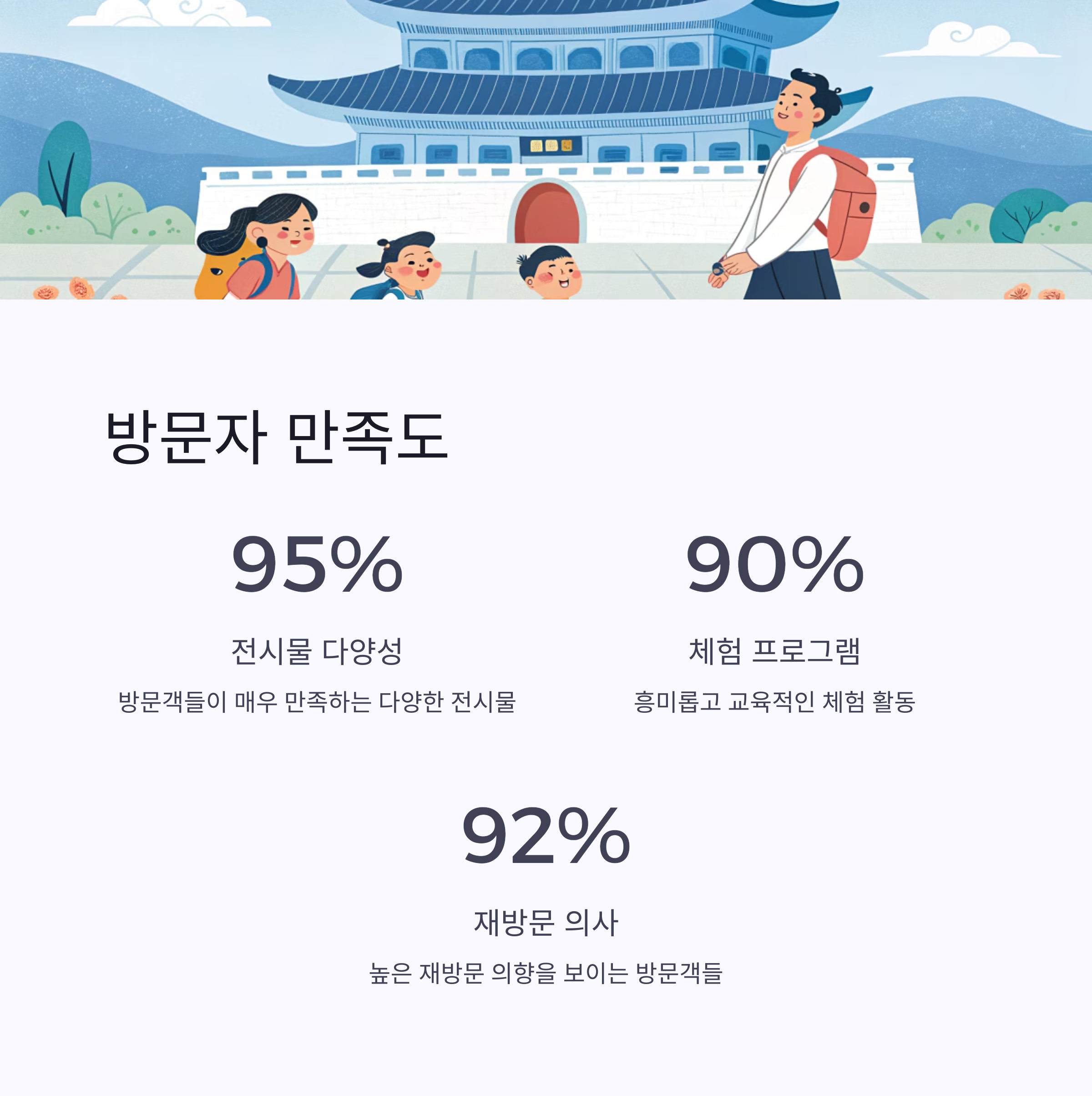 박물관 관람객들의 후기를 살펴보면 전반적으로 높은 만족도를 보여주고 있습니다. 시설, 접근성, 해설 서비스, 체험 프로그램에 대한 평이 매우 긍정적입니다. 특히 역사 교육과 가족 나들이를 겸할 수 있는 장소로 강력 추천됩니다.