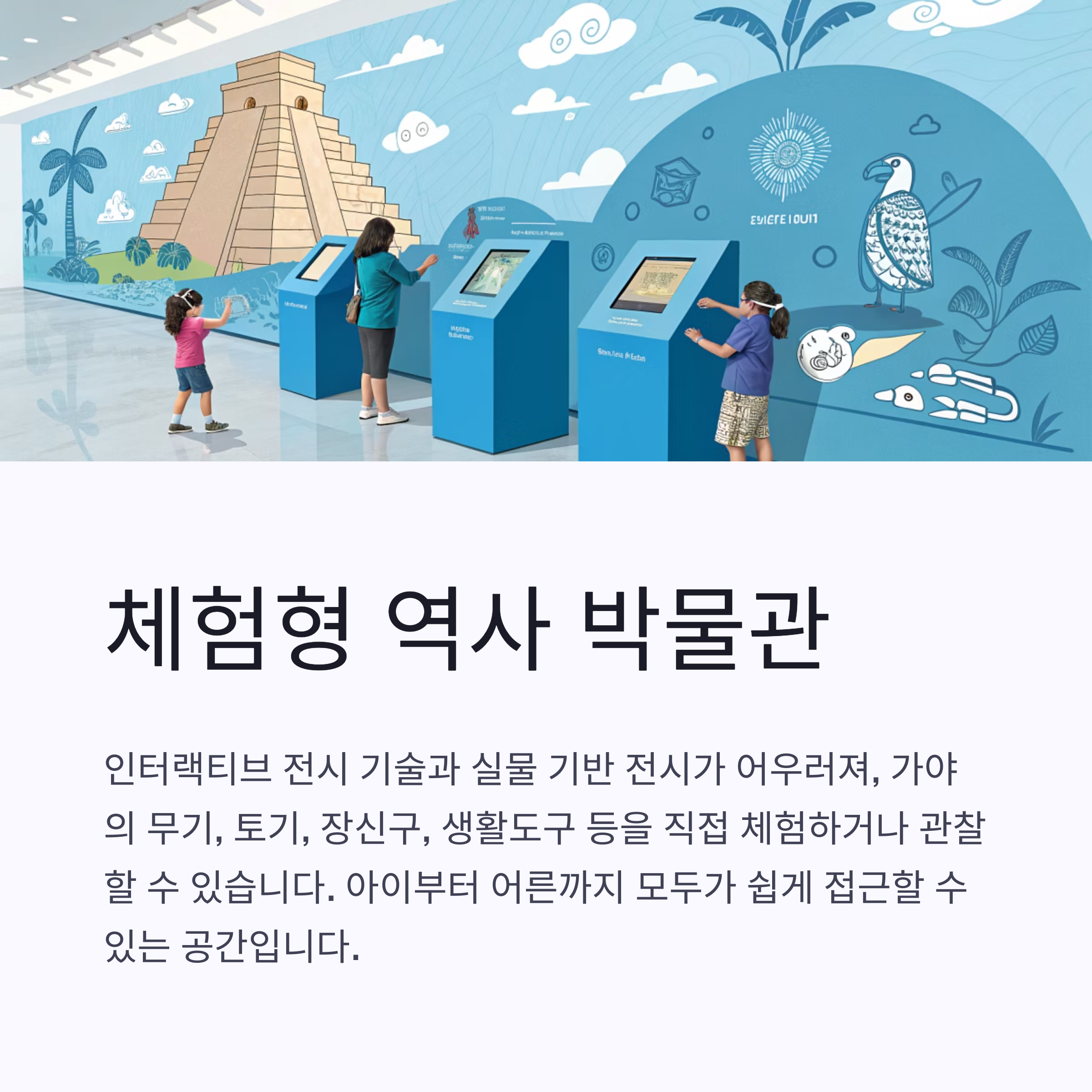 인터랙티브 전시 기술과 실물 기반 전시가 잘 어우러져, 가야의 무기, 토기, 장신구, 생활도구 등을 직접 체험하거나 눈앞에서 관찰할 수 있습니다. 이로써 가야인의 삶을 한층 더 깊이 있게 이해할 수 있습니다.