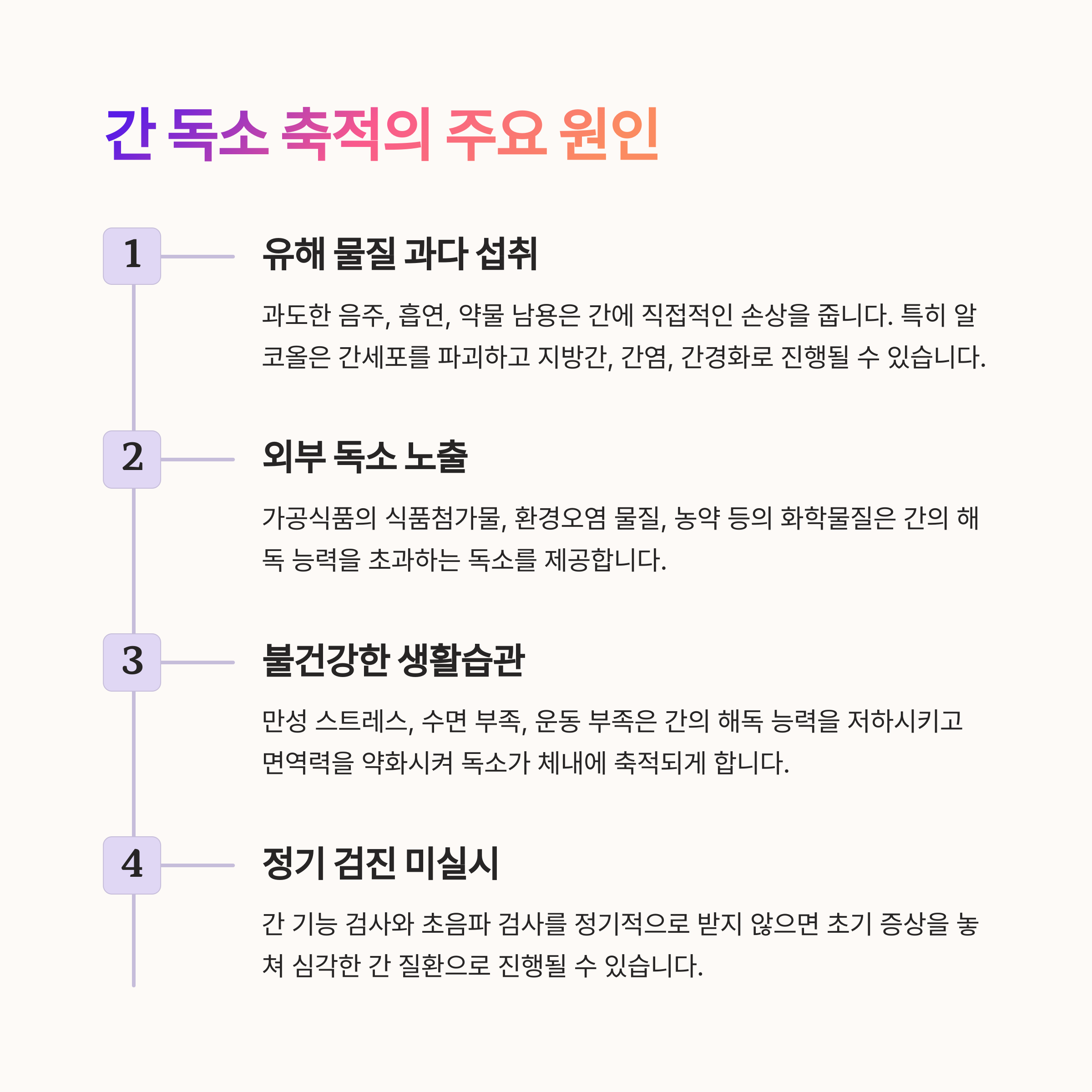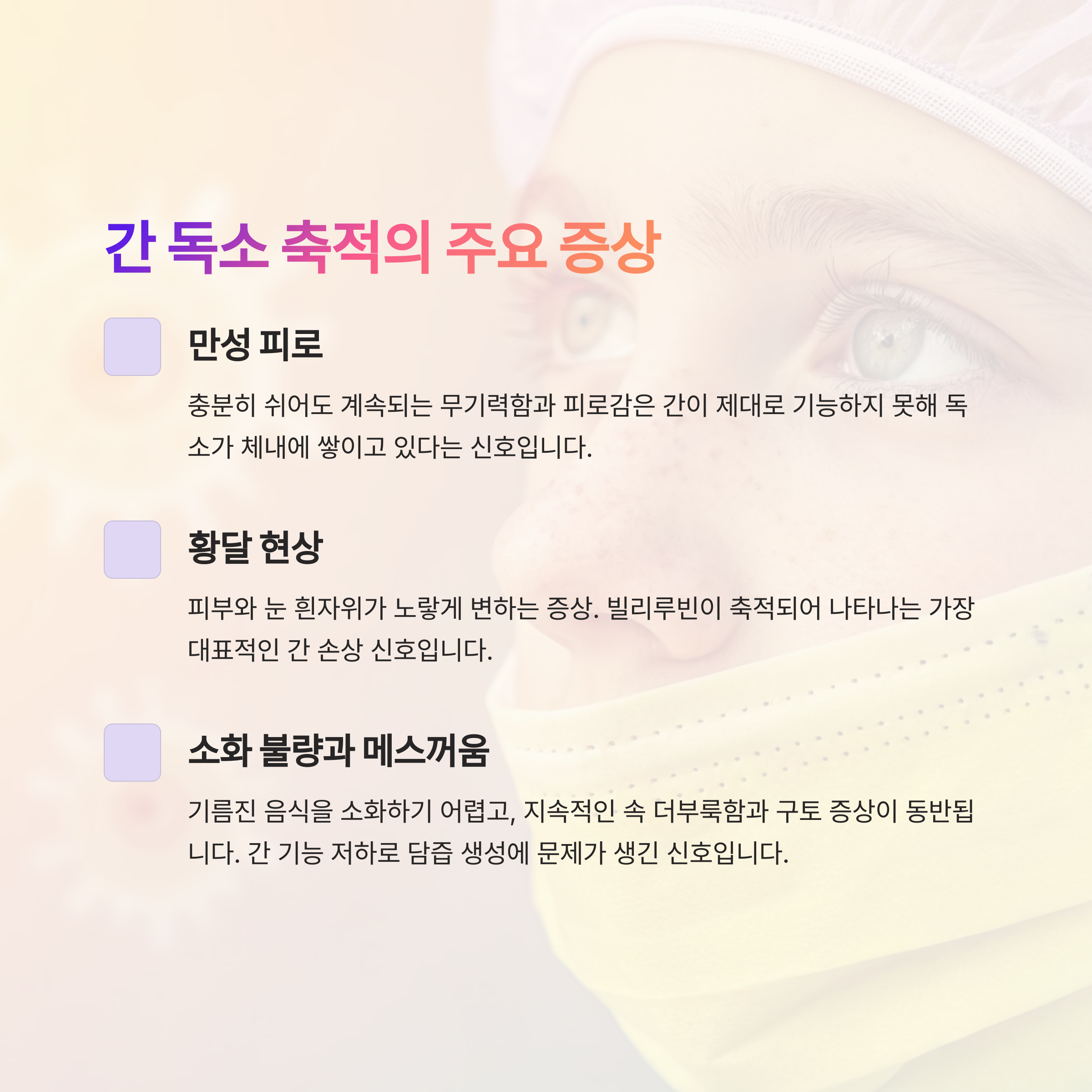 이러한 요인들이 간의 해독 능력을 떨어뜨리고, 독소가 체내에 쌓이게 만듭니다