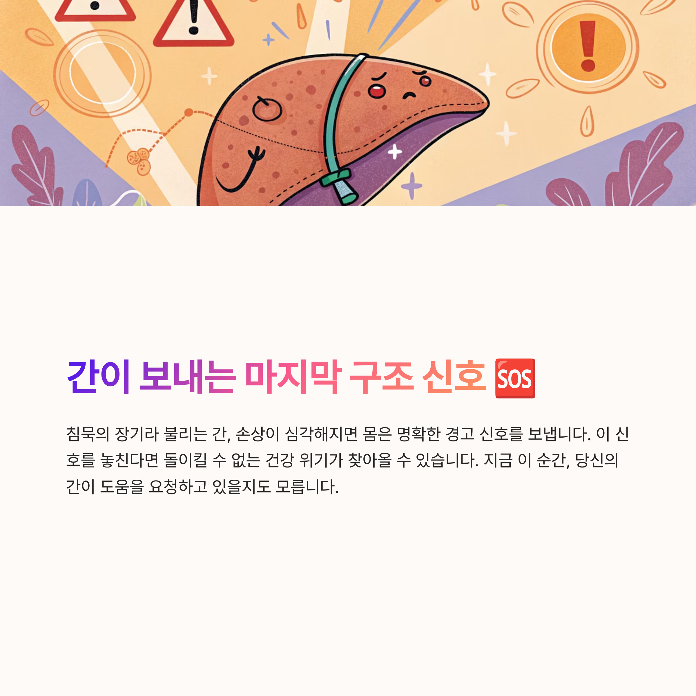 간은 침묵의 장기이기 때문에, 증상이 나타났을 때는 이미 상당한 손상이 진행된 경우가 많습니다. 위의 경고 신호를 무시하지 말고, 평소 간 건강을 지키는 습관을 실천하는 것이 무엇보다 중요합니다.