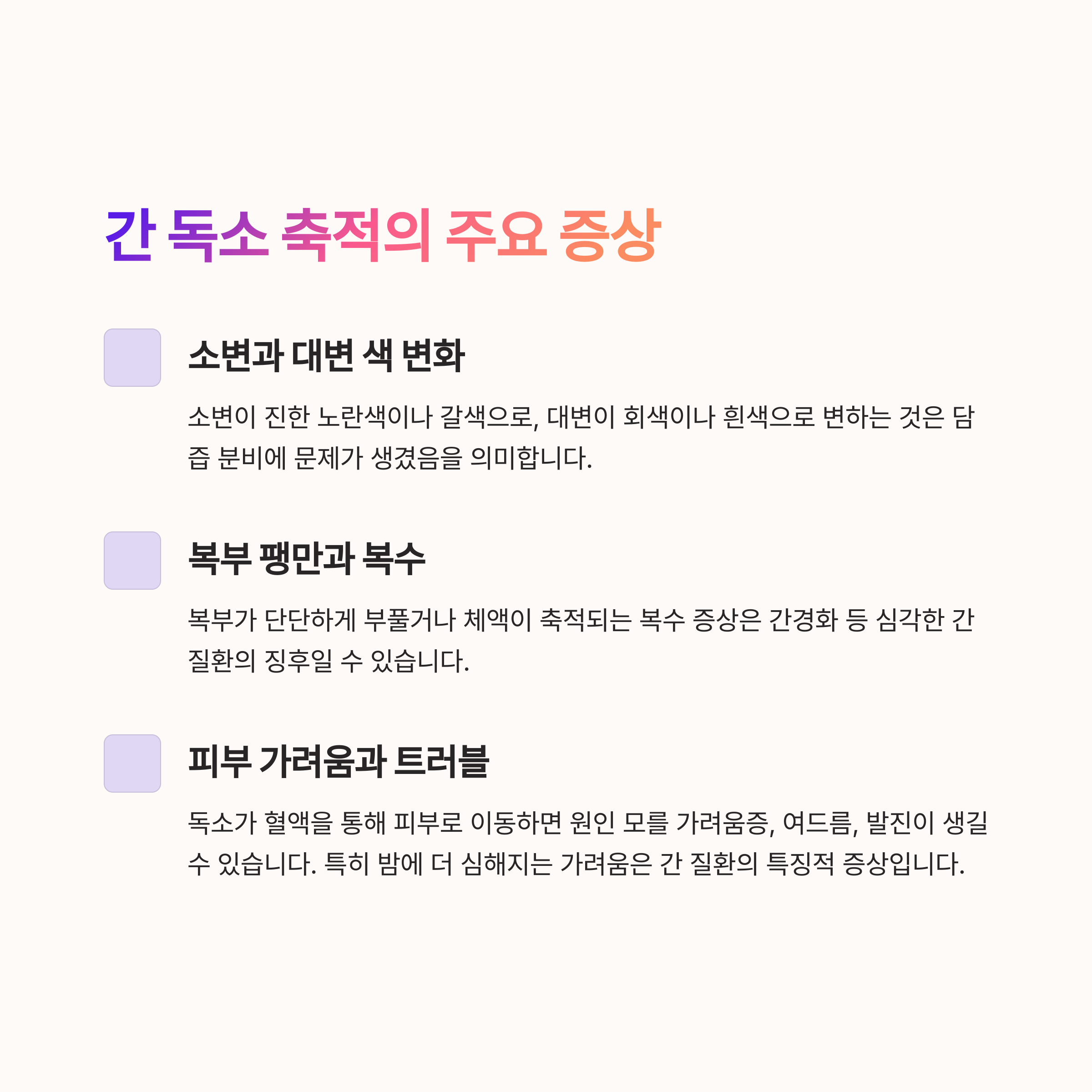 | 피부 가려움·트러블 | 독소가 혈액을 통해 피부로 이동해 가려움증, 여드름, 발진 등이 생김 |
