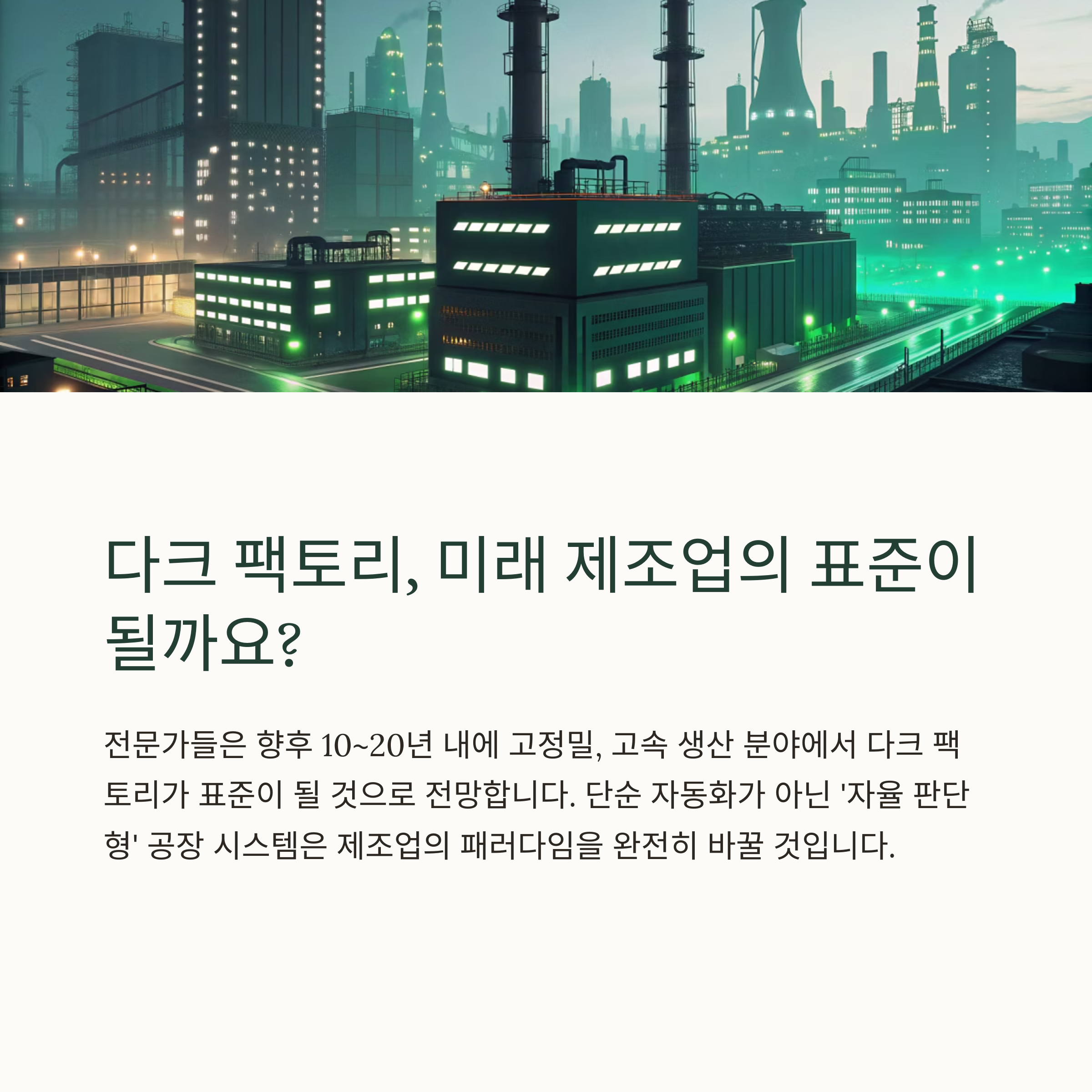 전문가들은 향후 10~20년 안에 다크 팩토리가 특정 산업에서는 표준이 될 수 있다고 전망합니다.