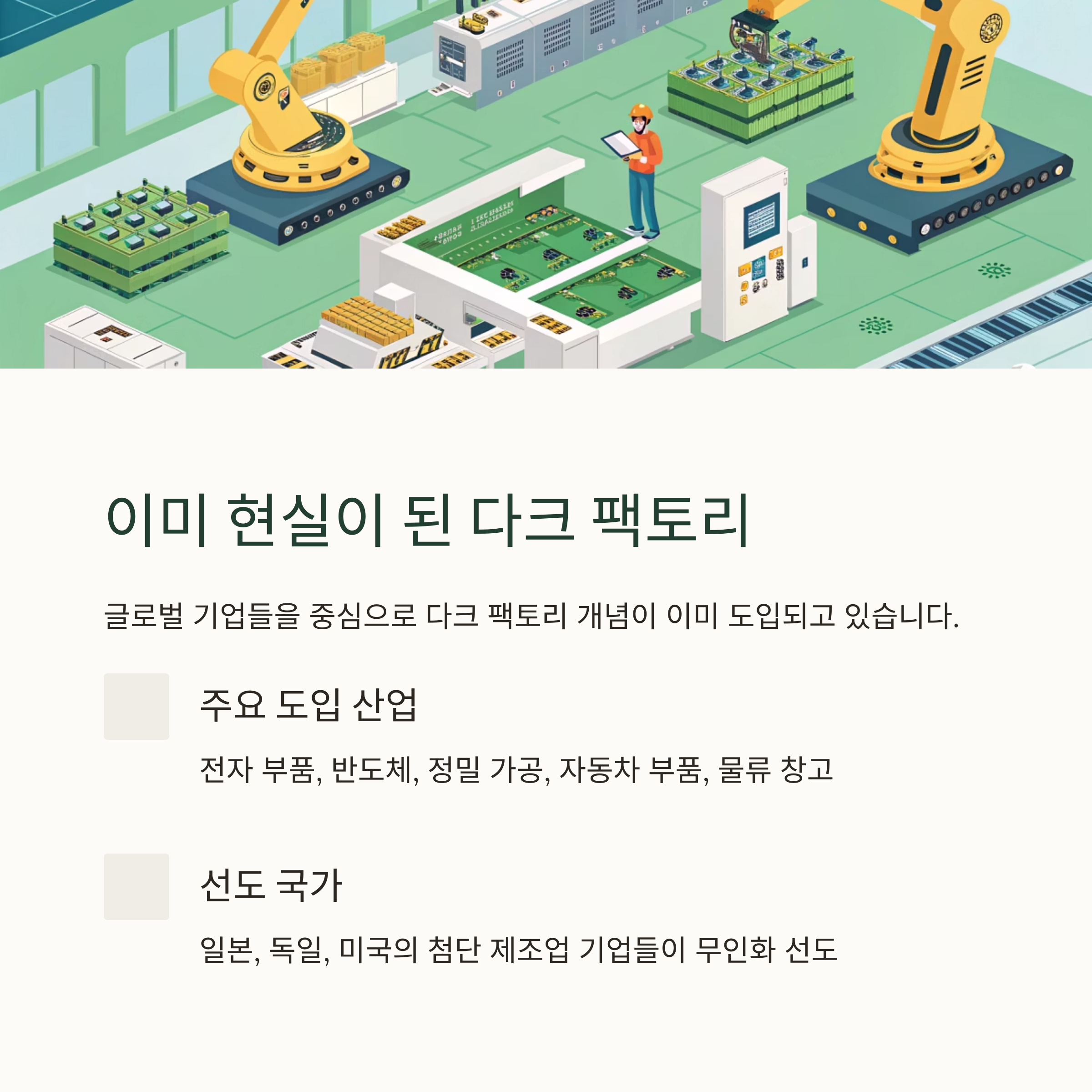 도입되고 있습니다. 일본, 독일, 미국의 테슬라등 제조업 기업들이 선도적으로 무인화를 실험하고 있으며, 국내에서도 자동차 부품 공장이나 물류 창고에 다크 팩토리 개념이 적용되고 있습니다.