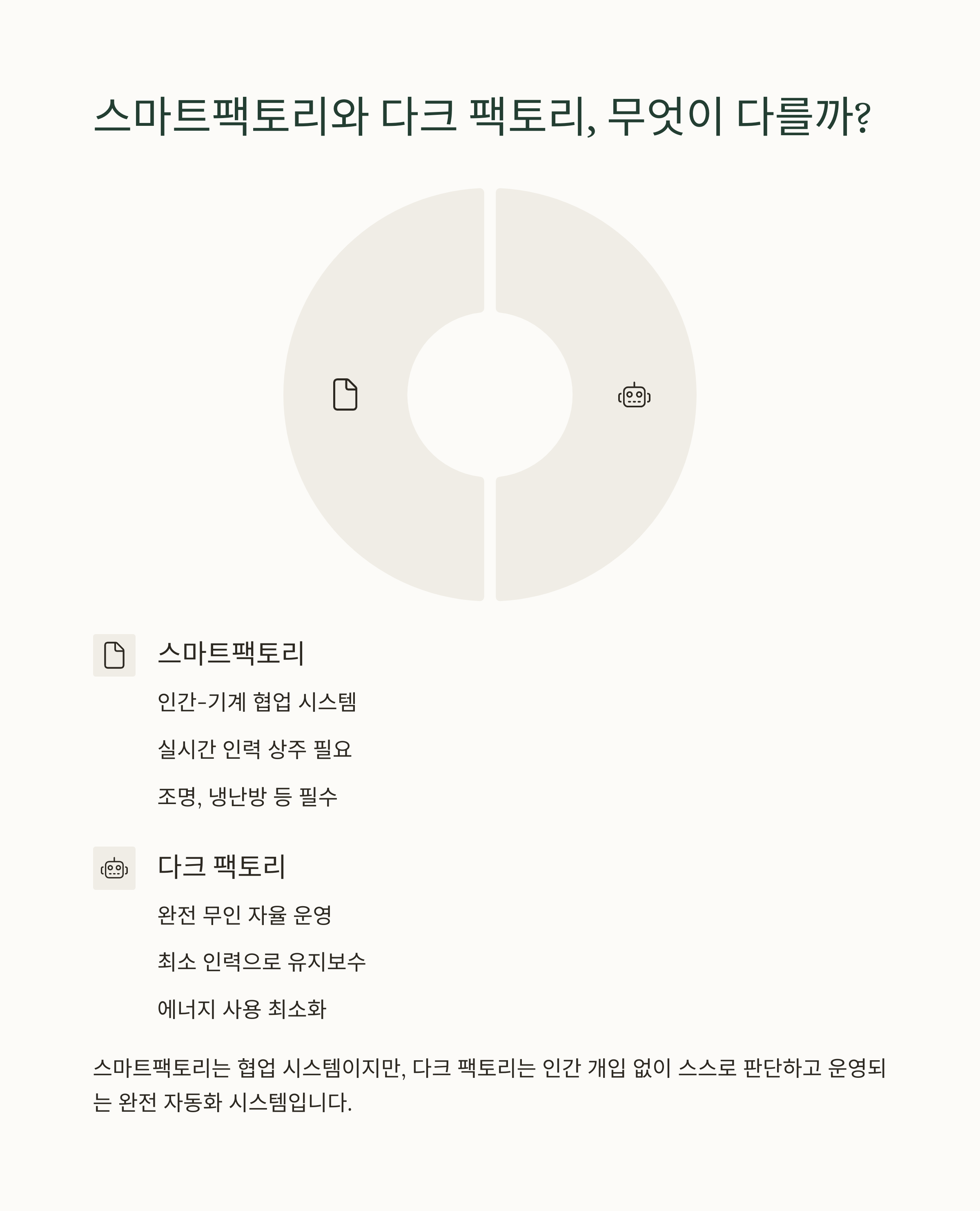 스마트팩토리는 인간과 자동화 시스템이 협업하는 형태라면, 다크 팩토리는 인간 개입 없이 스스로 판단하고 움직이는