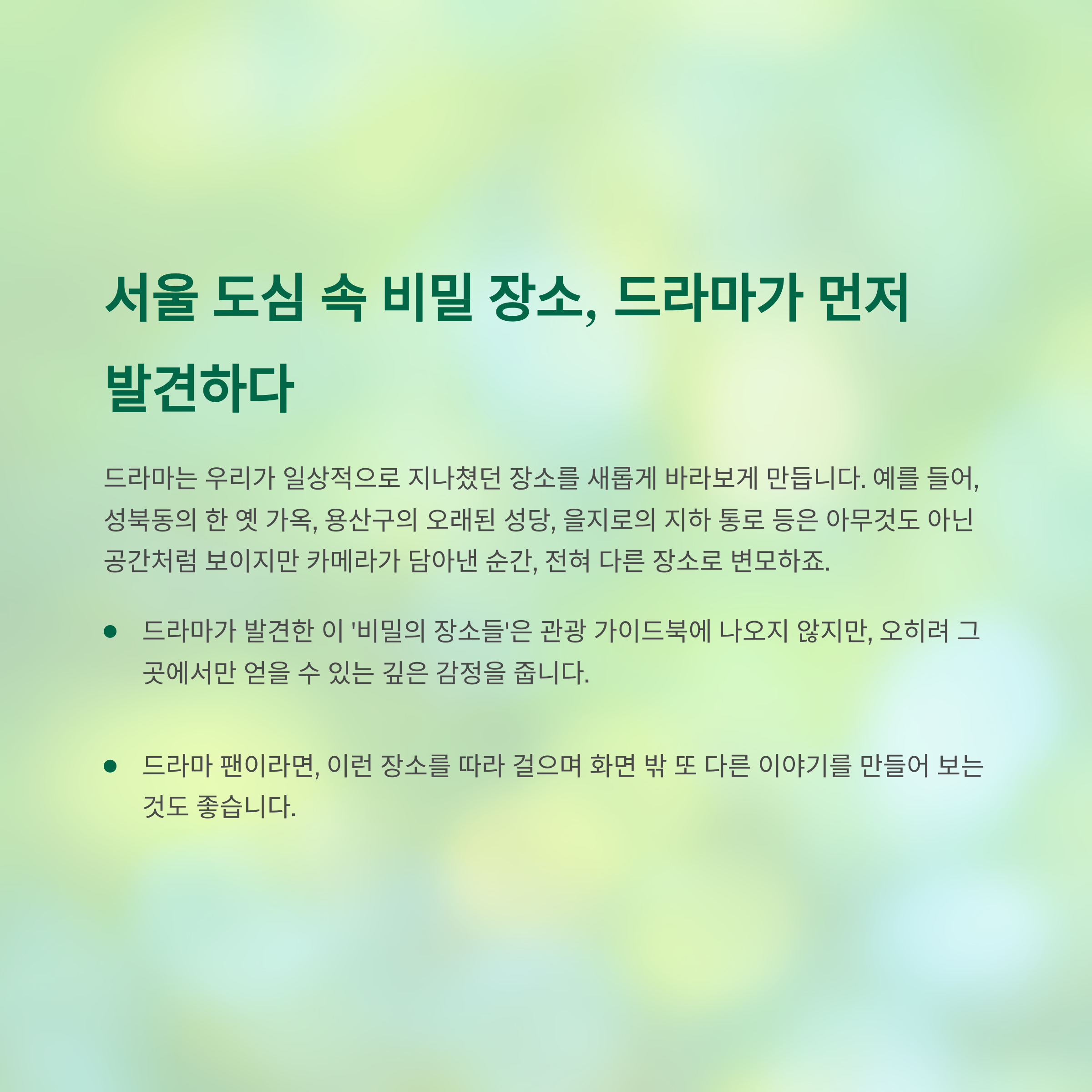 드라마는 우리가 일상적으로 지나쳤던 장소를 새롭게 바라보게 만듭니다.