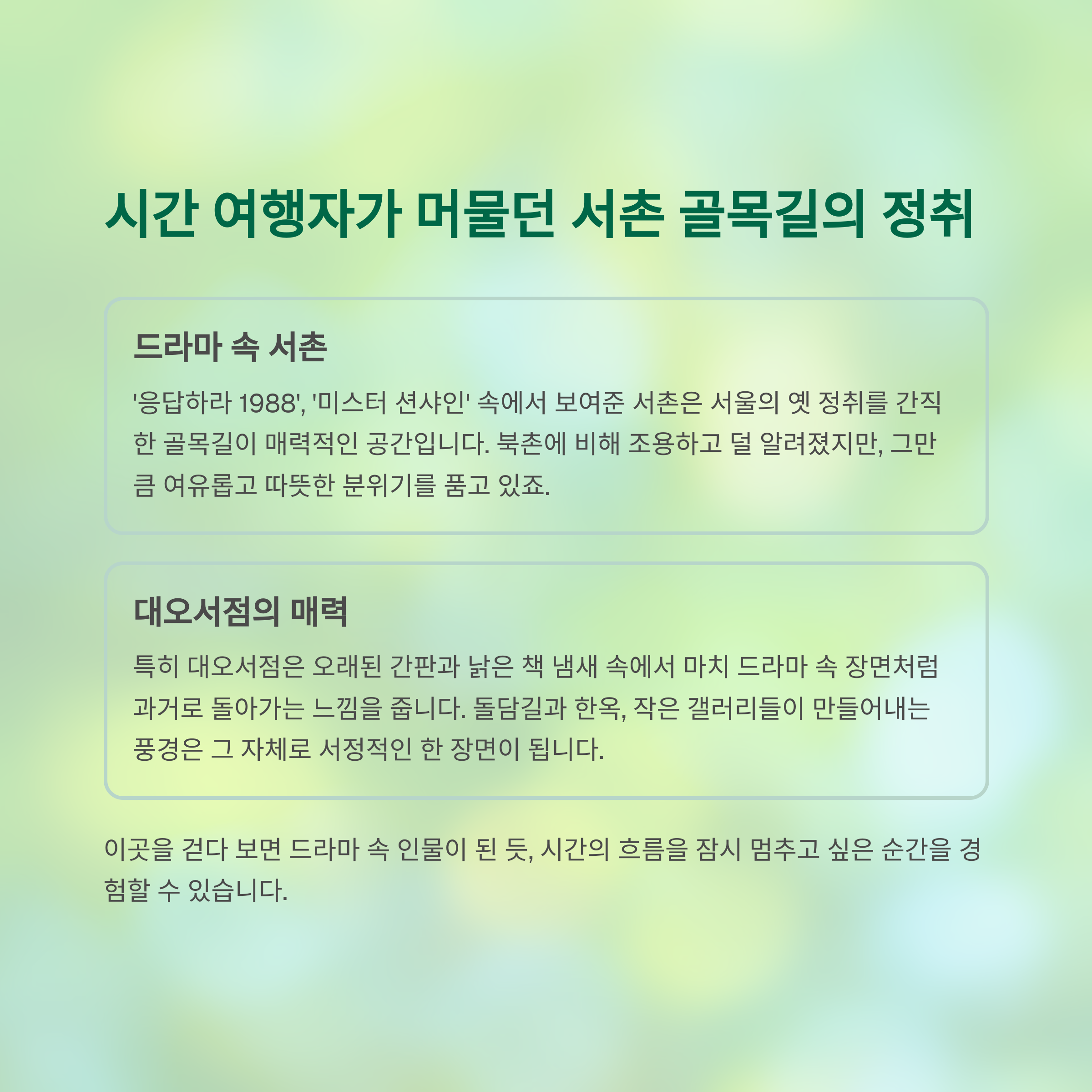 북촌에 비해 조용하고 덜 알려졌지만, 그만큼 여유롭고 따뜻한 분위기를 품고 있죠. 특히 대오서점은 오래된 간판과 낡은 책 냄새 속에서 마치 드라마 속 장면처럼 과거로 돌아가는 느낌을 줍니다. 돌담길과 한옥, 작은 갤러리들이 만들어내는 풍경은 그 자체로 서정적인 한 장면이 됩니다. 이곳을 걷다 보면 드라마 속 인물이 된 듯, 시간의 흐름을 잠시 멈추고 싶은 순간을 경험할 수 있습니다.