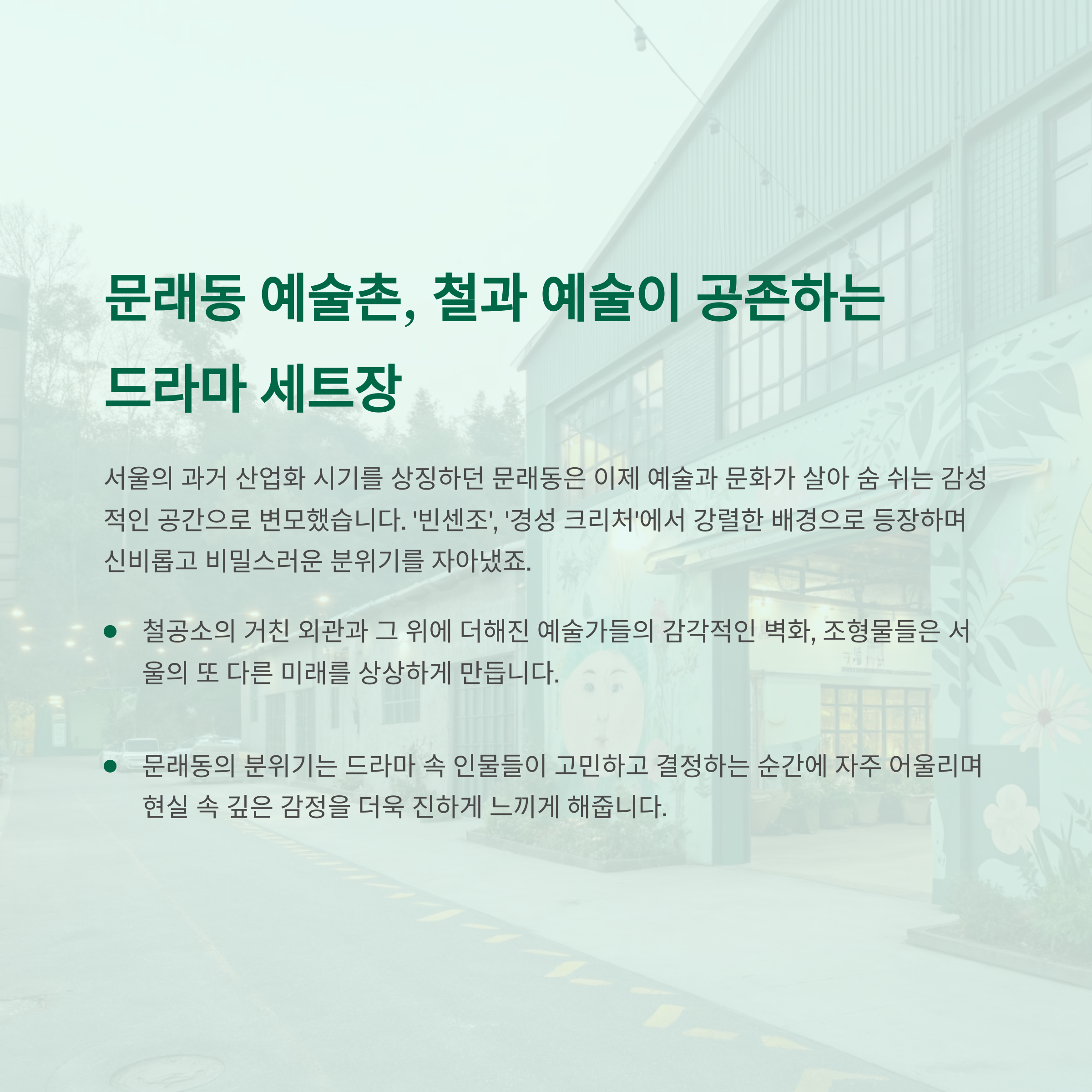 문래동 분위기는 드라마 속 인물들이 고민하고 결정하는 순간에 자주 어울리며 현실 속 깊은 감정을 더욱 진하게 느끼게 해줍니다.