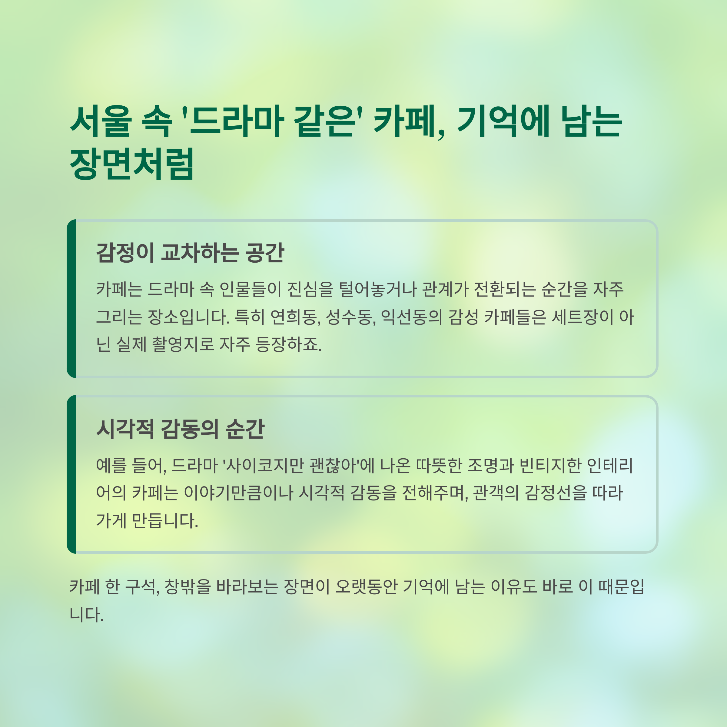 특히 연희동, 성수동, 익선동의 감성 카페들은 세트장이 아닌 실제 촬영지로 자주 등장하죠.