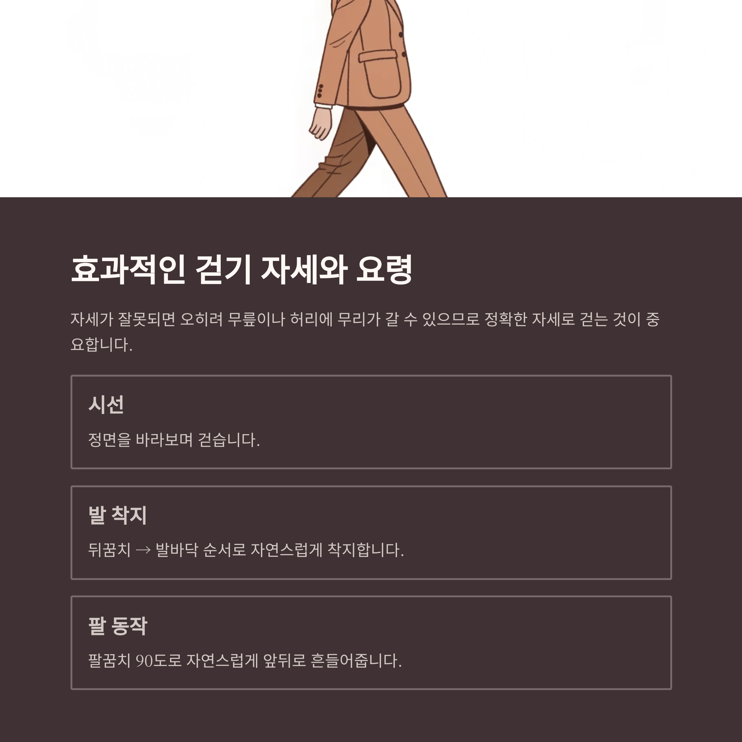 자세가 잘못되면 오히려 무릎이나 허리에 무리가 갈 수 있으므로 정확한 자세로 걷는 것이 중요합니다.