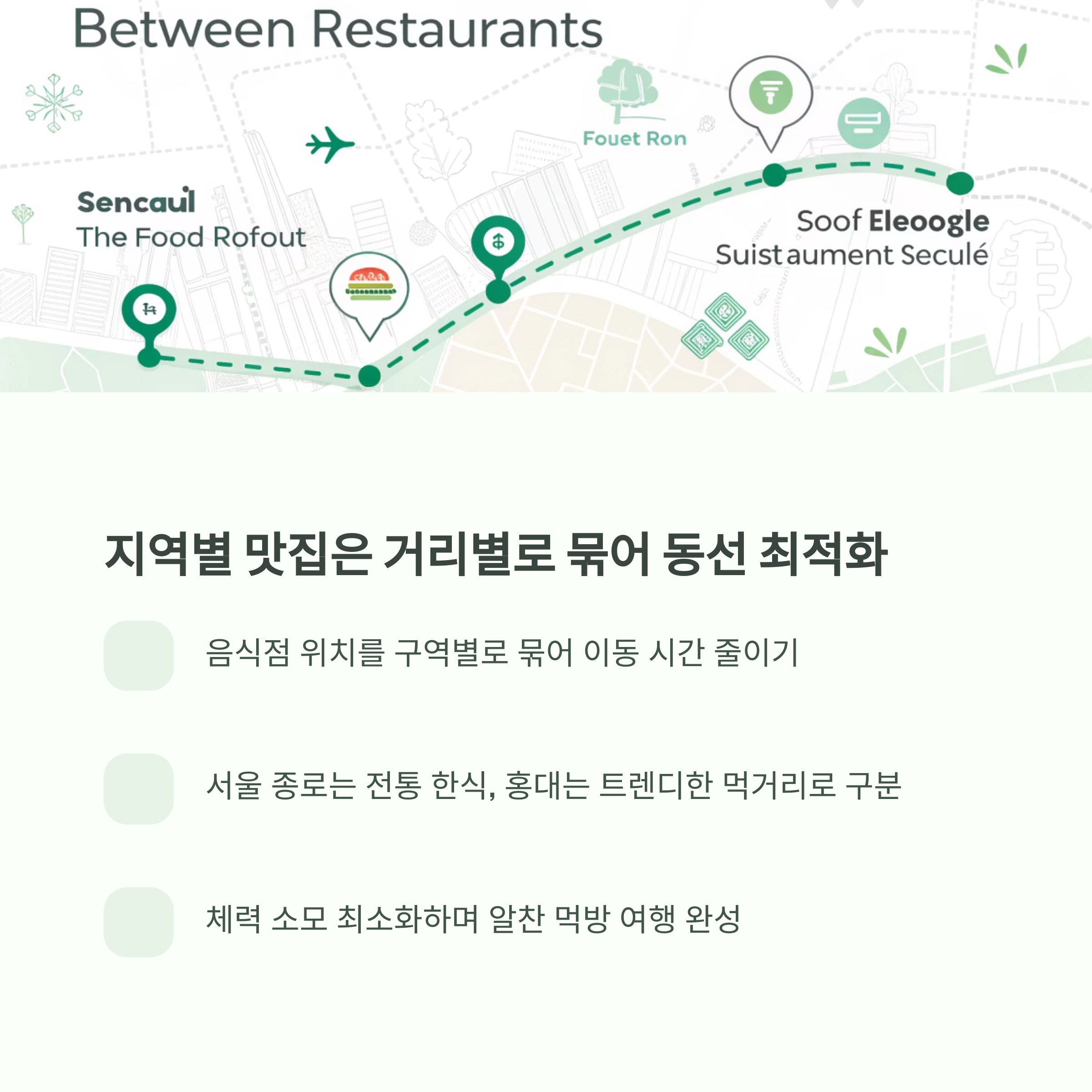 음식점이 위치한 거리나 구역을 중심으로 루트를 짜면