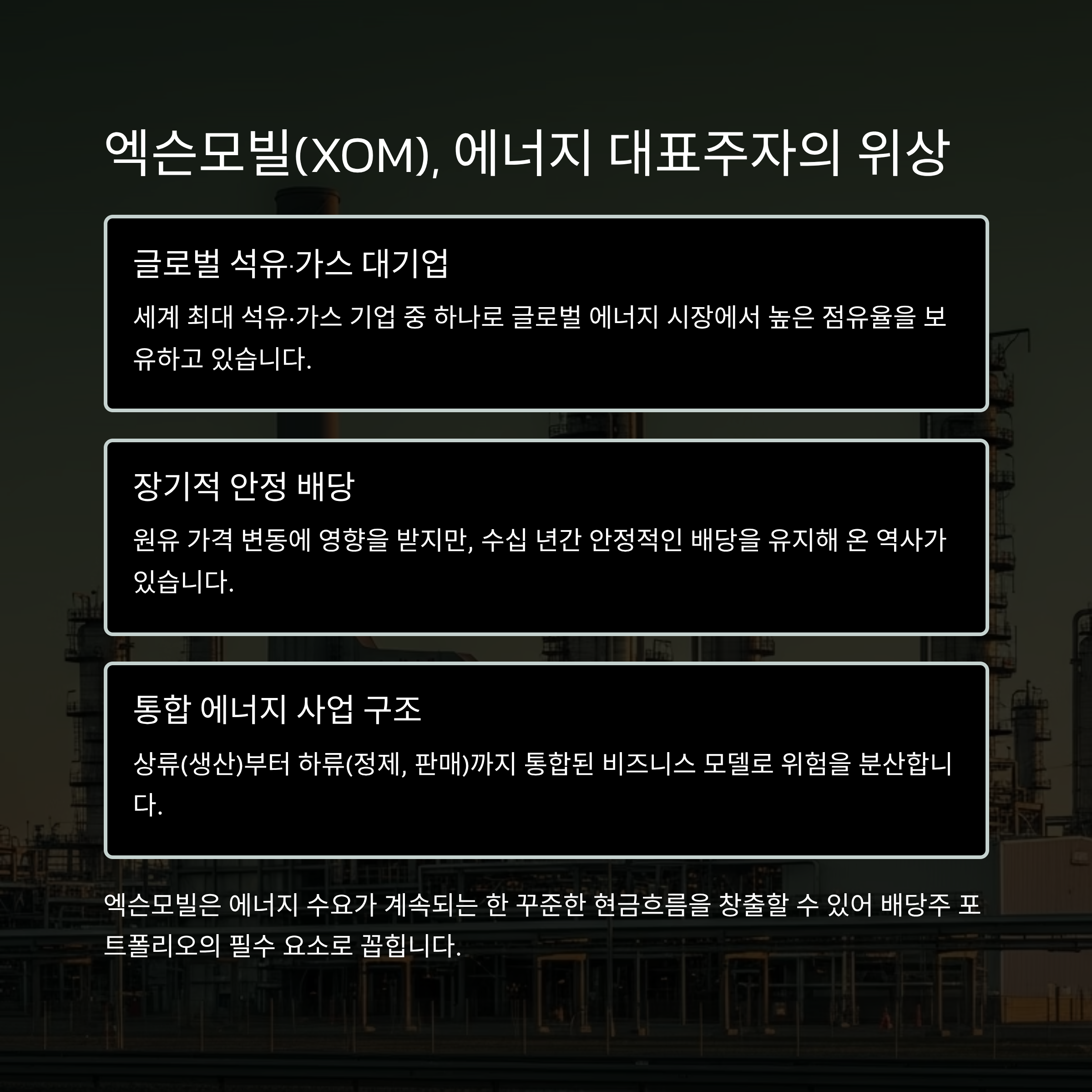 | 엑슨모빌 | XOM | 에너지 | 장기 배당 유지, 원유 가격 민감 |