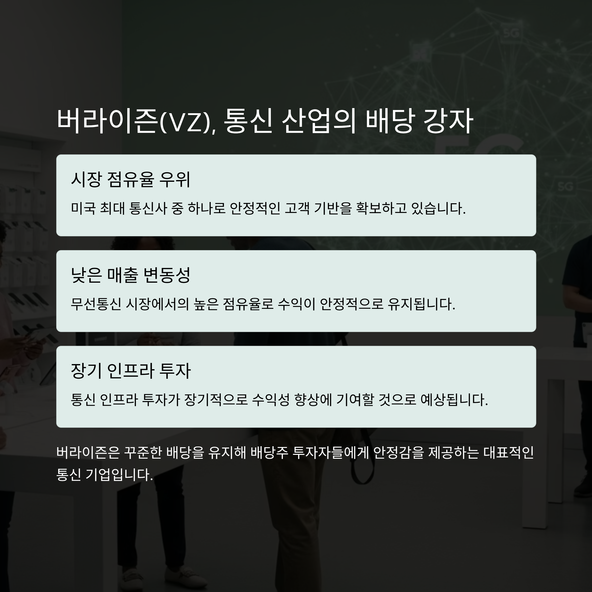 | 버라이즌 | VZ | 통신 | 무선 점유율 높음, 꾸준한 배당 |