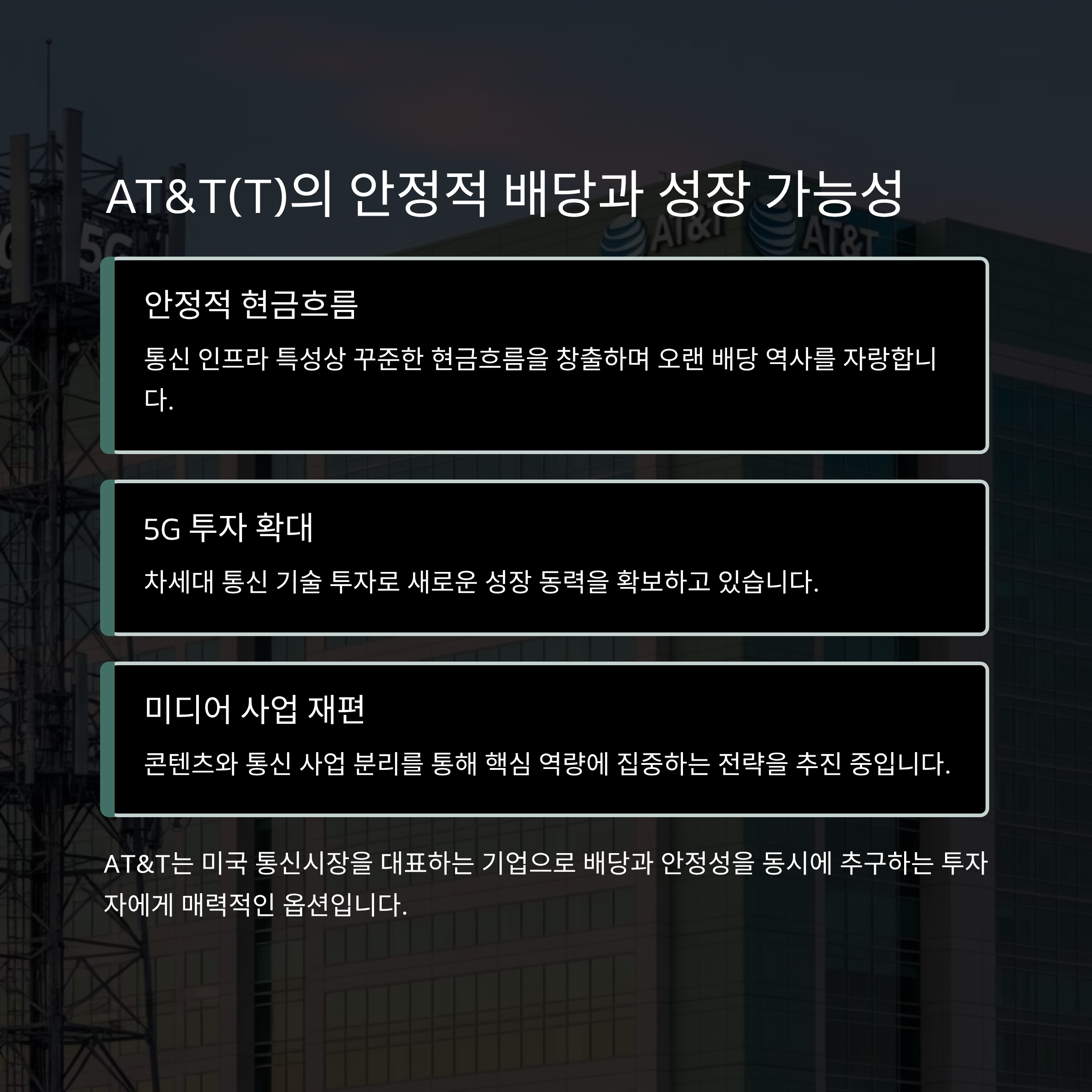 | AT&T | T | 통신 | 안정적 배당, 5G 투자 |
