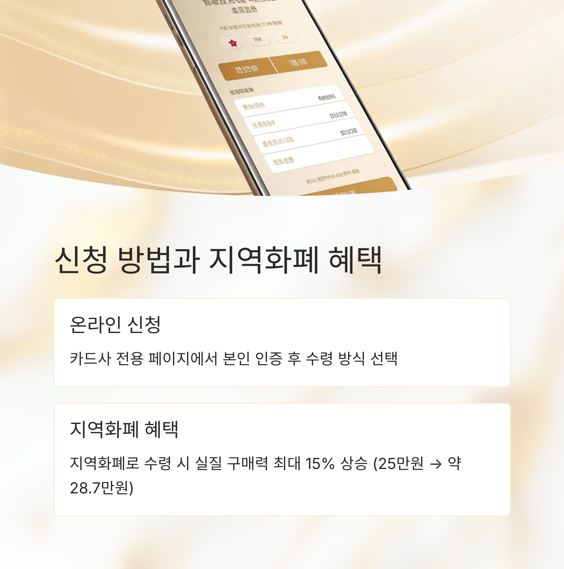 지역화폐 또는 지역상품권으로 수령 시 최대 15% 추가 구매력 상승 효과도 기대할 수 있습니다.