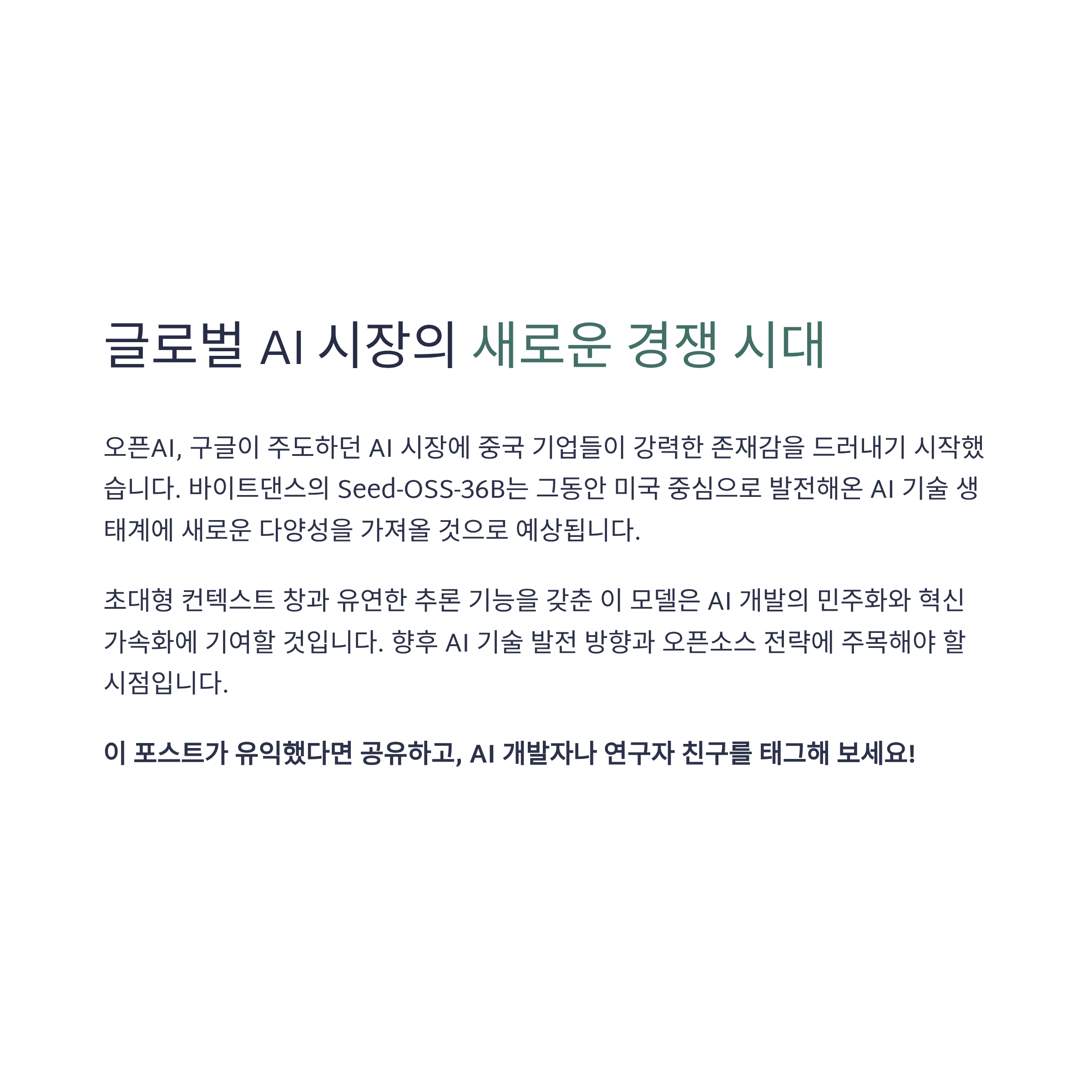 바이트댄스의 Seed-OSS-36B 출시는 딥시크(DeepSeek), 알리바바 클라우드 등 중국 AI 기업과 미국 빅테크(OpenAI, 구글 등) 중심 경쟁 구도에 본격적으로 뛰어드는 신호탄으로 평가받고 있습니다.