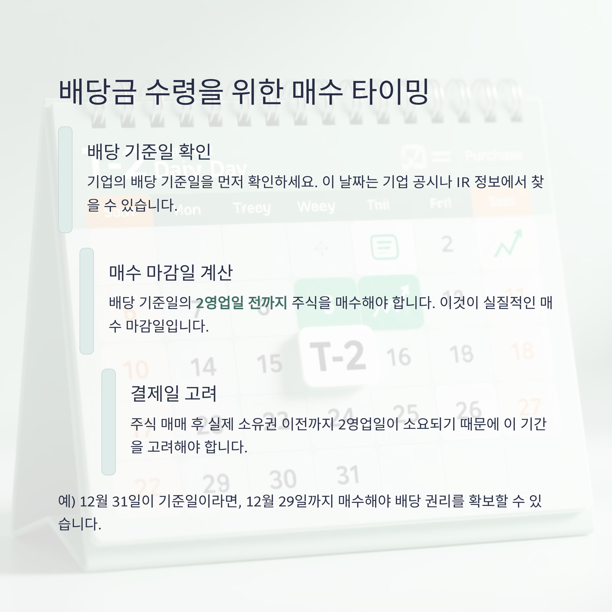 예를 들어 12월 31일이 기준일이라면, 12월 29일까지 매수하여야 배당 권리를 확보할 수 있습니다.