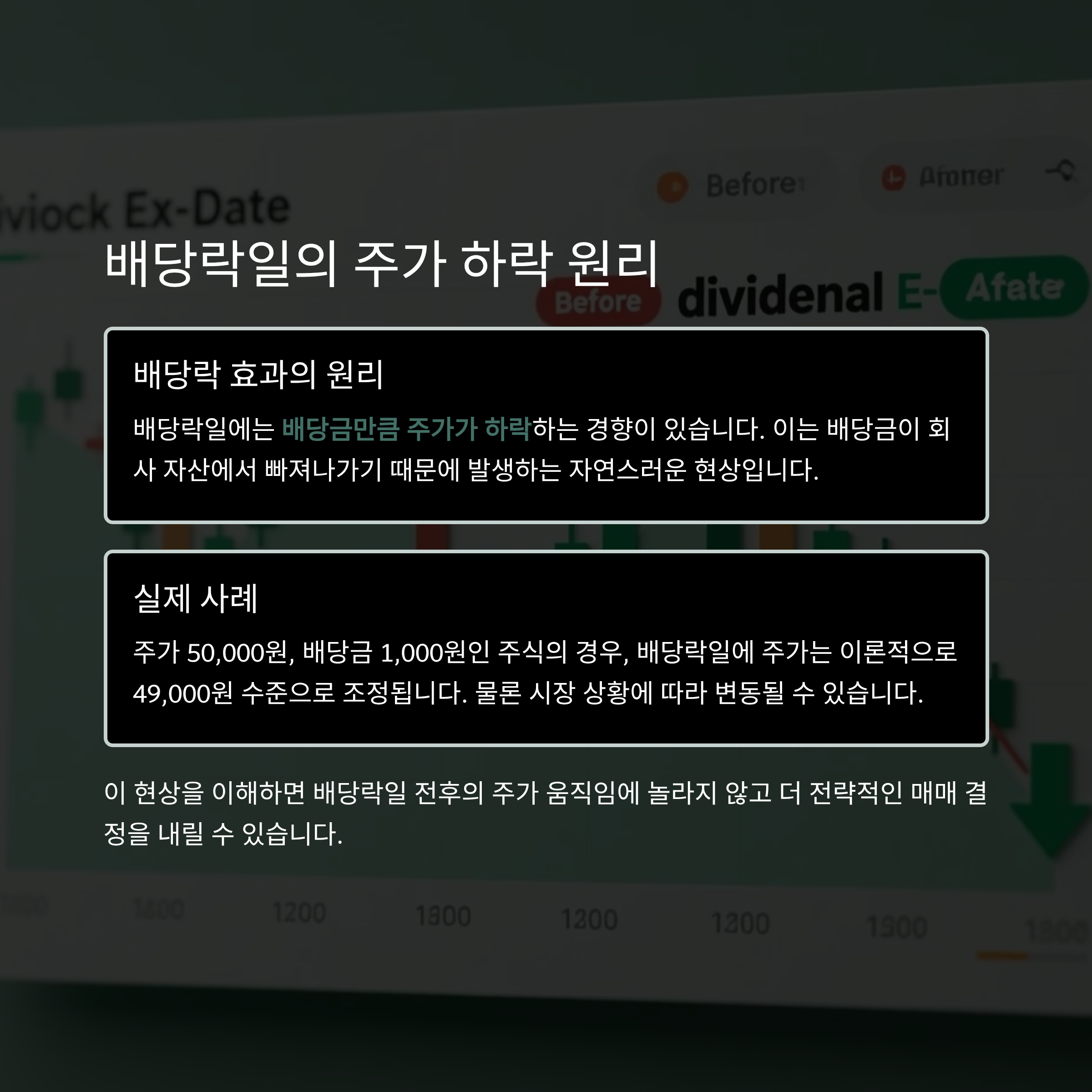 예를 들어 주가가 50,000원이고 배당금이 1,000원이라면, 배당락일에 주가는 49,000원 수준으로 조정될 수 있습니다.