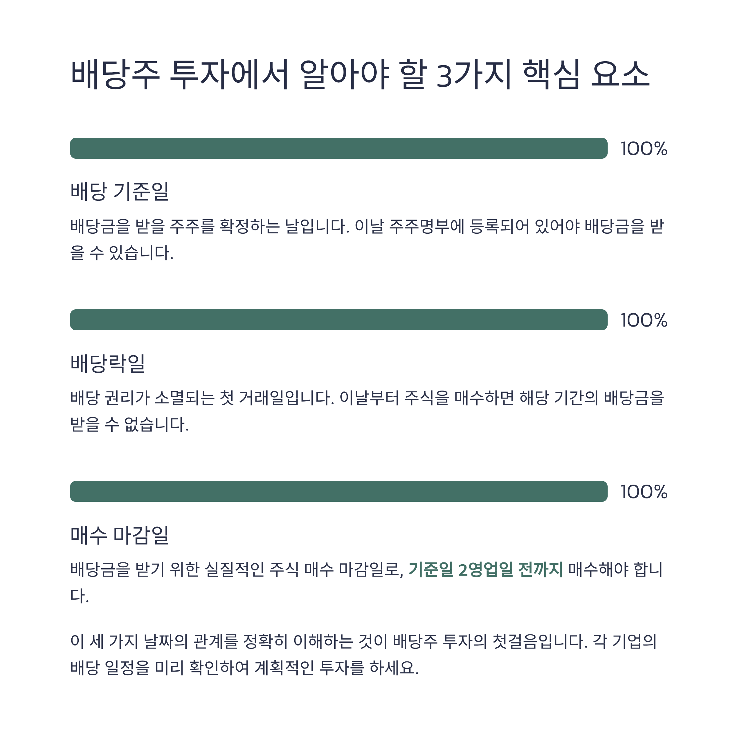 예를 들어 12월 31일이 기준일이라면, 12월 29일까지 매수하여야 배당 권리를 확보할 수 있습니다.