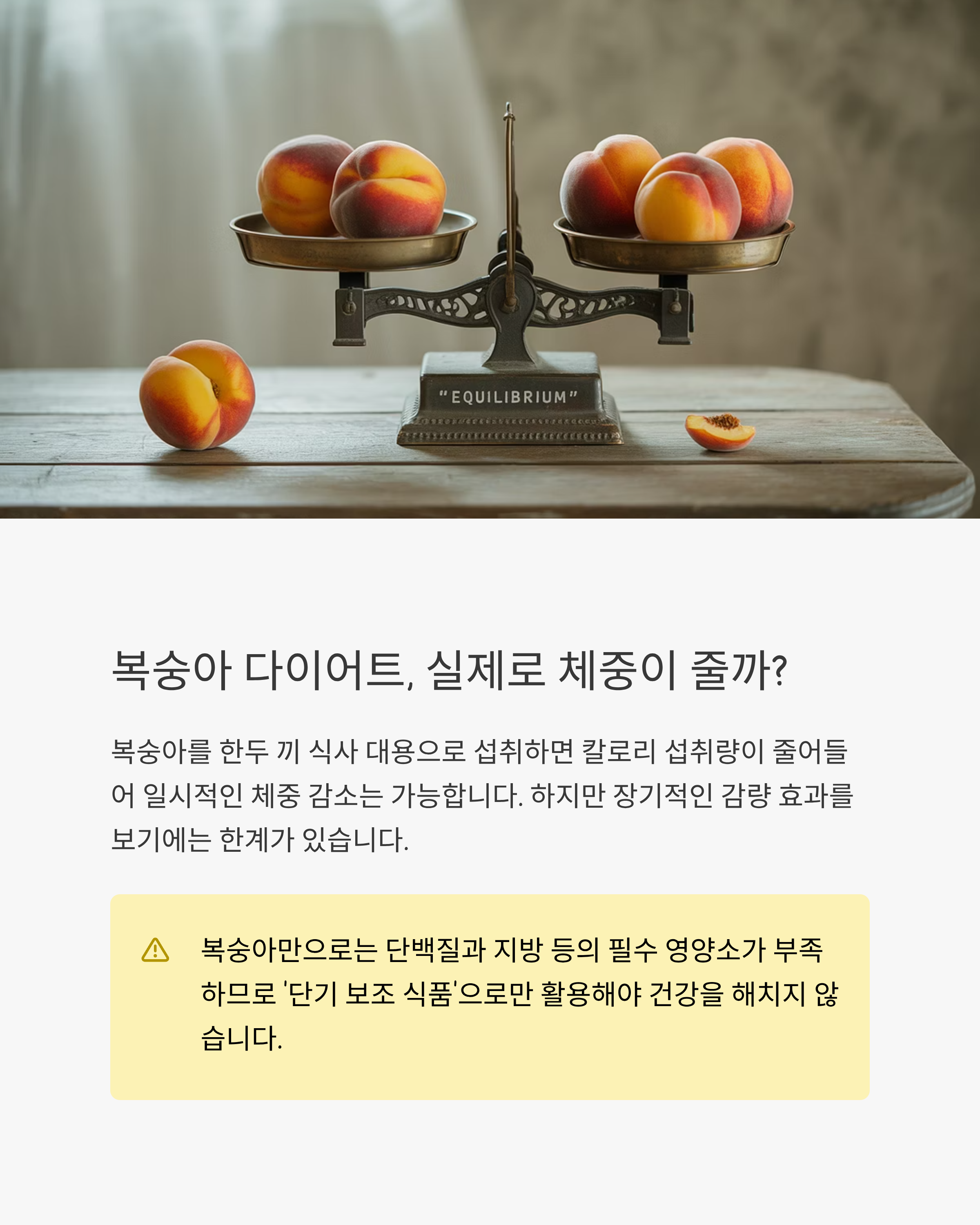 복숭아만으로 다이어트를 성공하기는 어렵지만, 적절히 활용한다면 식단 관리에 큰 도움이 됩니다.