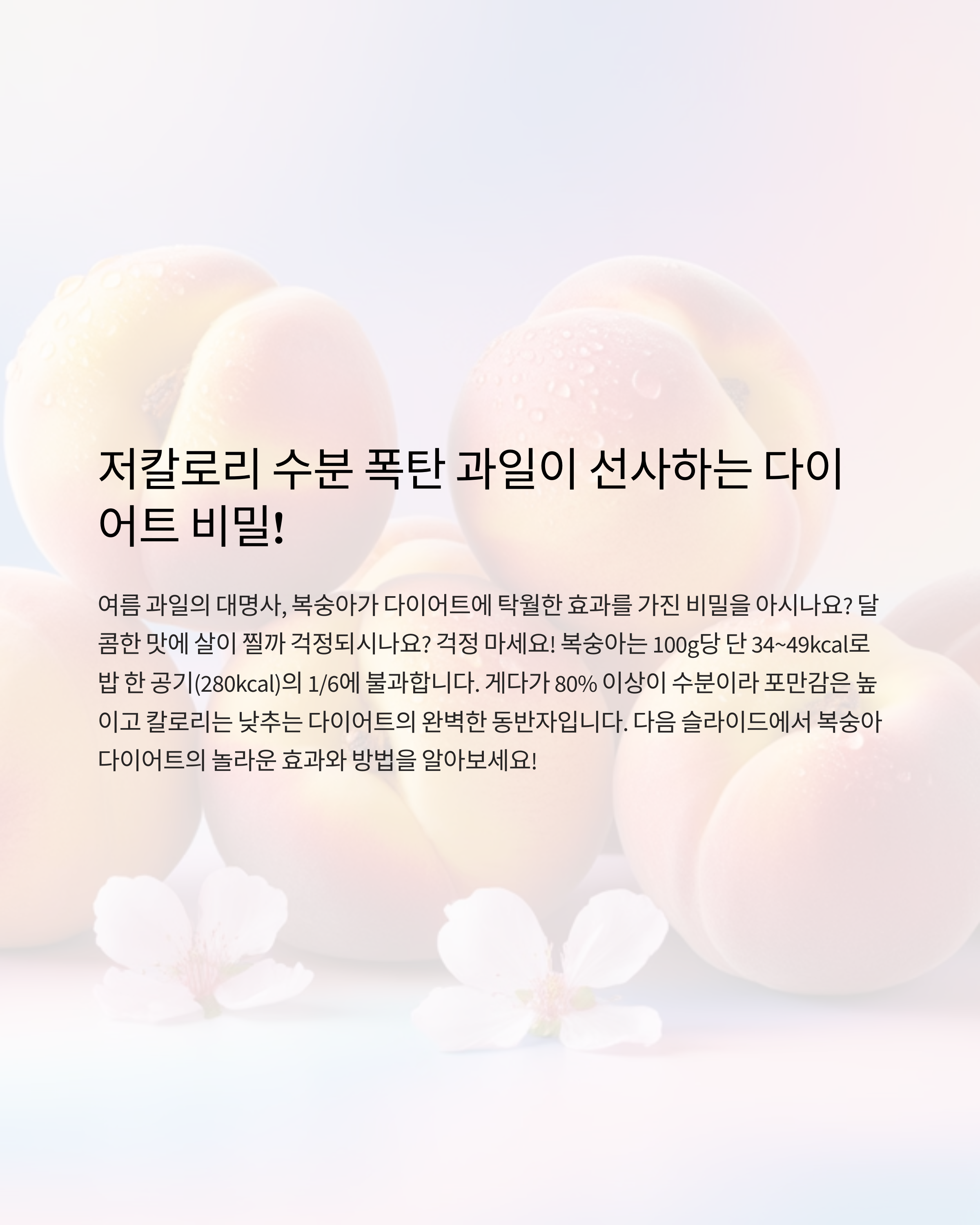 달콤한 복숭아로 맛과 건강 모두 지키는 똑똑한 다이어트! 오늘부터 한 개의 복숭아로 내 몸을 더 가볍고 건강하게 만들어보면 어떨까요?