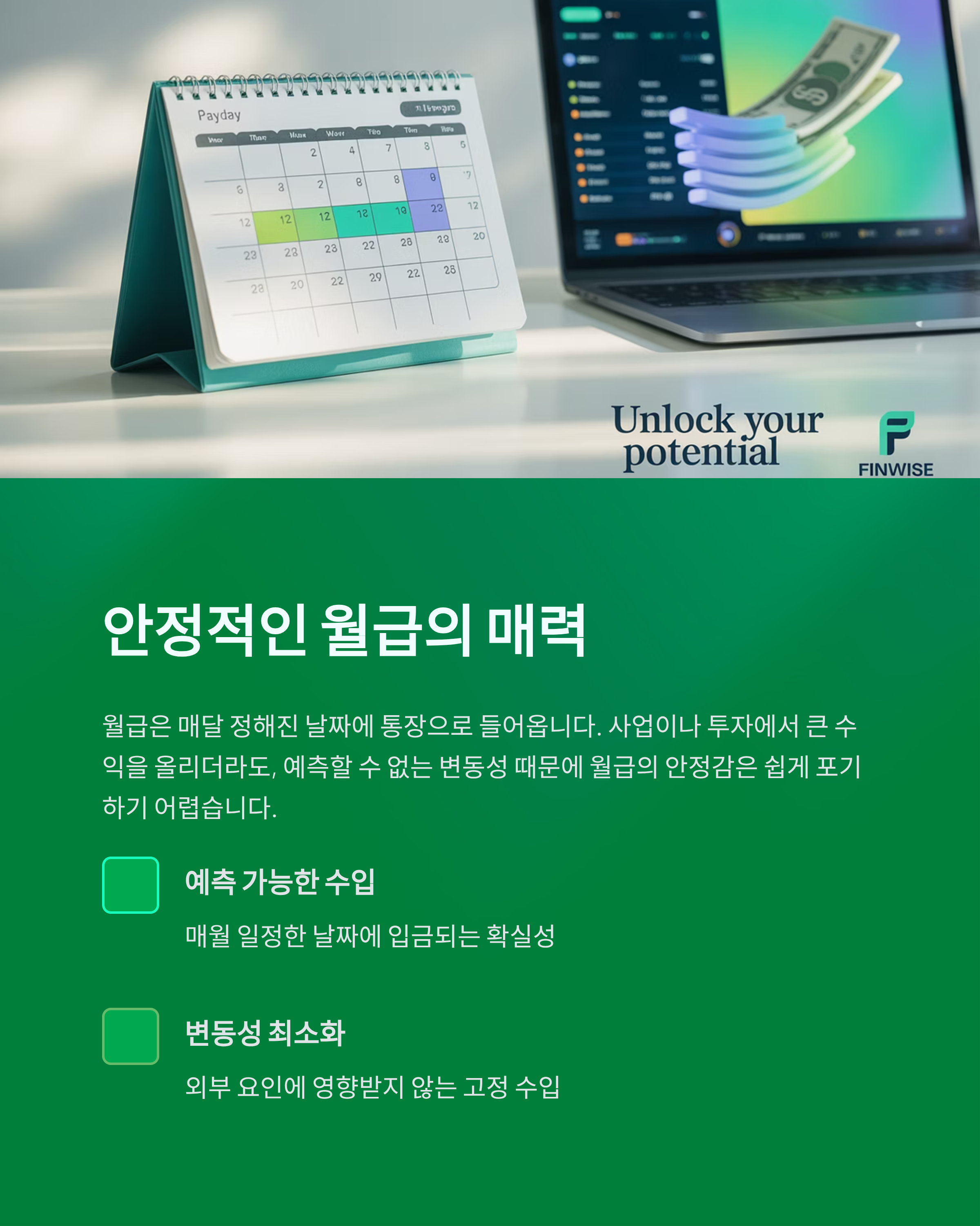 월급은 매달 정해진 날짜에 통장으로 들어옵니다. 사업이나 투자에서 큰 수익을 올리더라도, 예측할 수 없는 변동성 때문에 월급의 안정감은 쉽게 포기하기 어렵습니다.