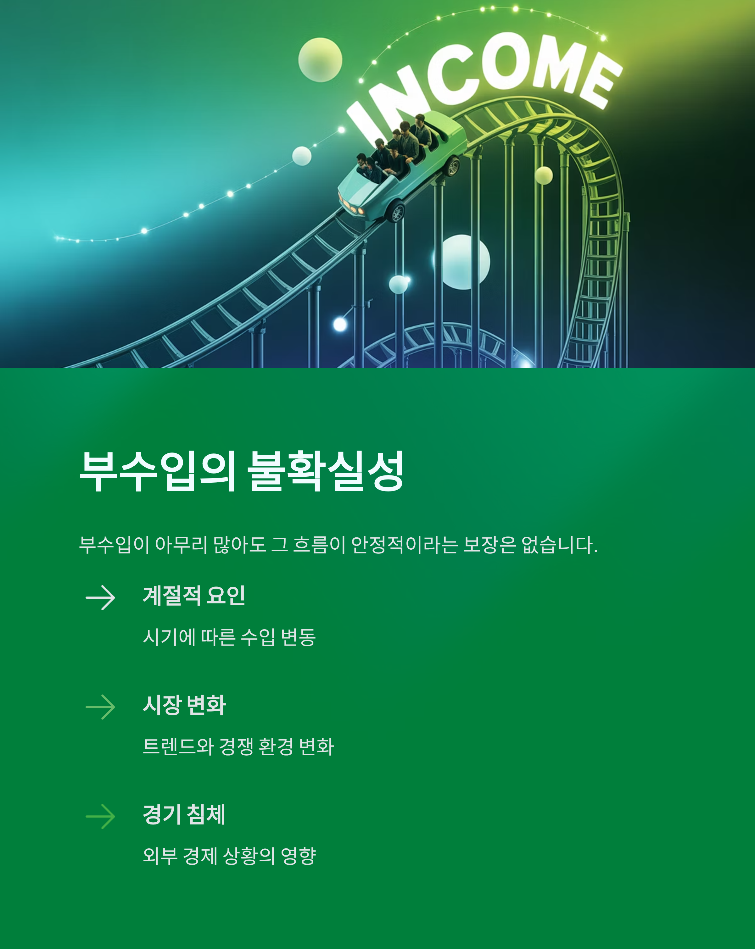 부수입이 아무리 많아도 그 흐름이 안정적이라는 보장은 없습니다. 계절적 요인, 시장 변화, 경기 침체 등 외부 요인 하나에 수입이 크게 줄어들 수 있습니다. 이 불확실성이 직장을 놓지 못하는 가장 큰 이유 중 하나입니다.
