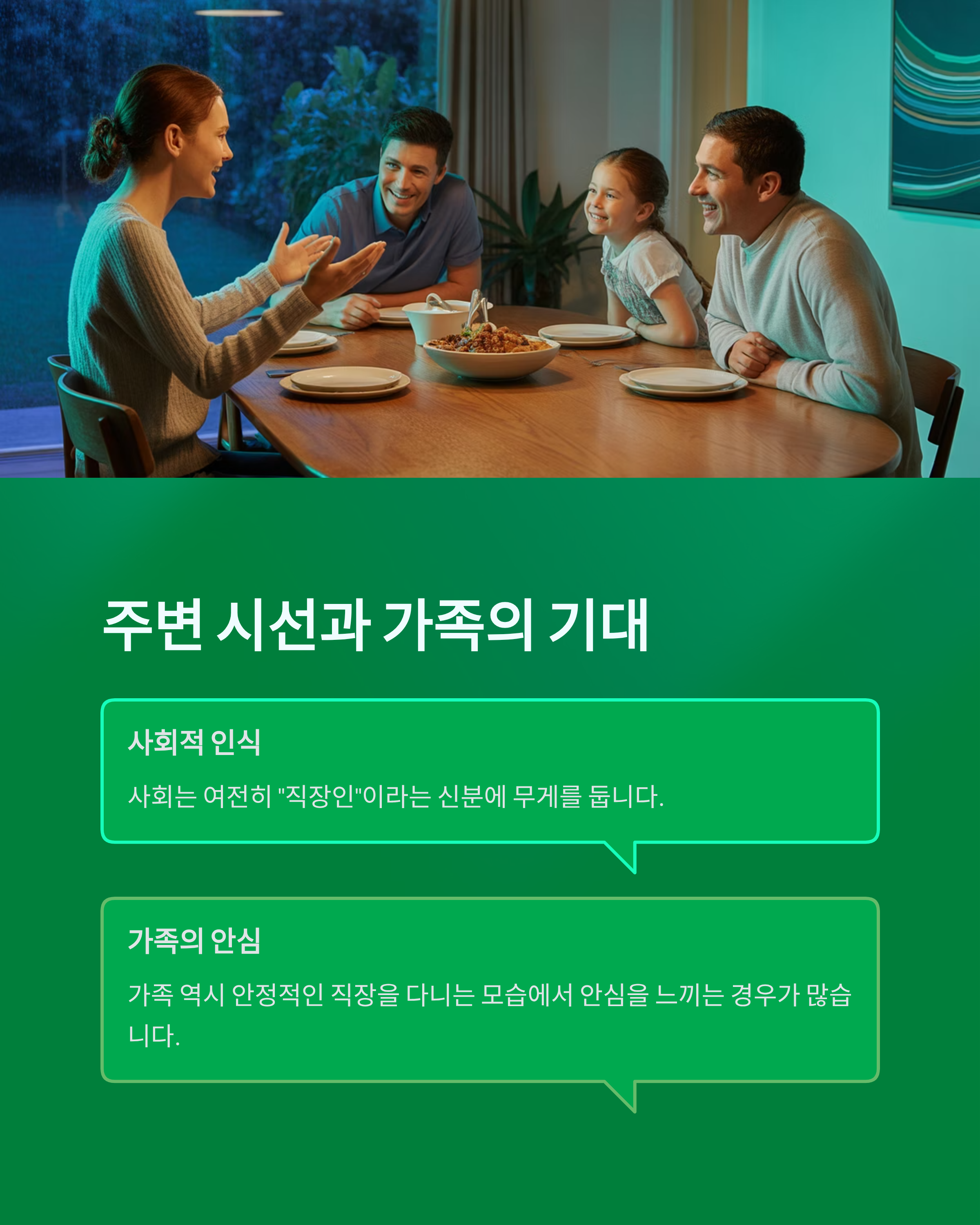 사회는 여전히 "직장인"이라는 신분에 무게를 둡니다. 가족 역시 안정적인 직장을 다니는 모습에서 안심을 느끼는 경우가 많습니다. 안정과 성실이라는 이미지가 주는 위안은 결코 작지 않습니다.