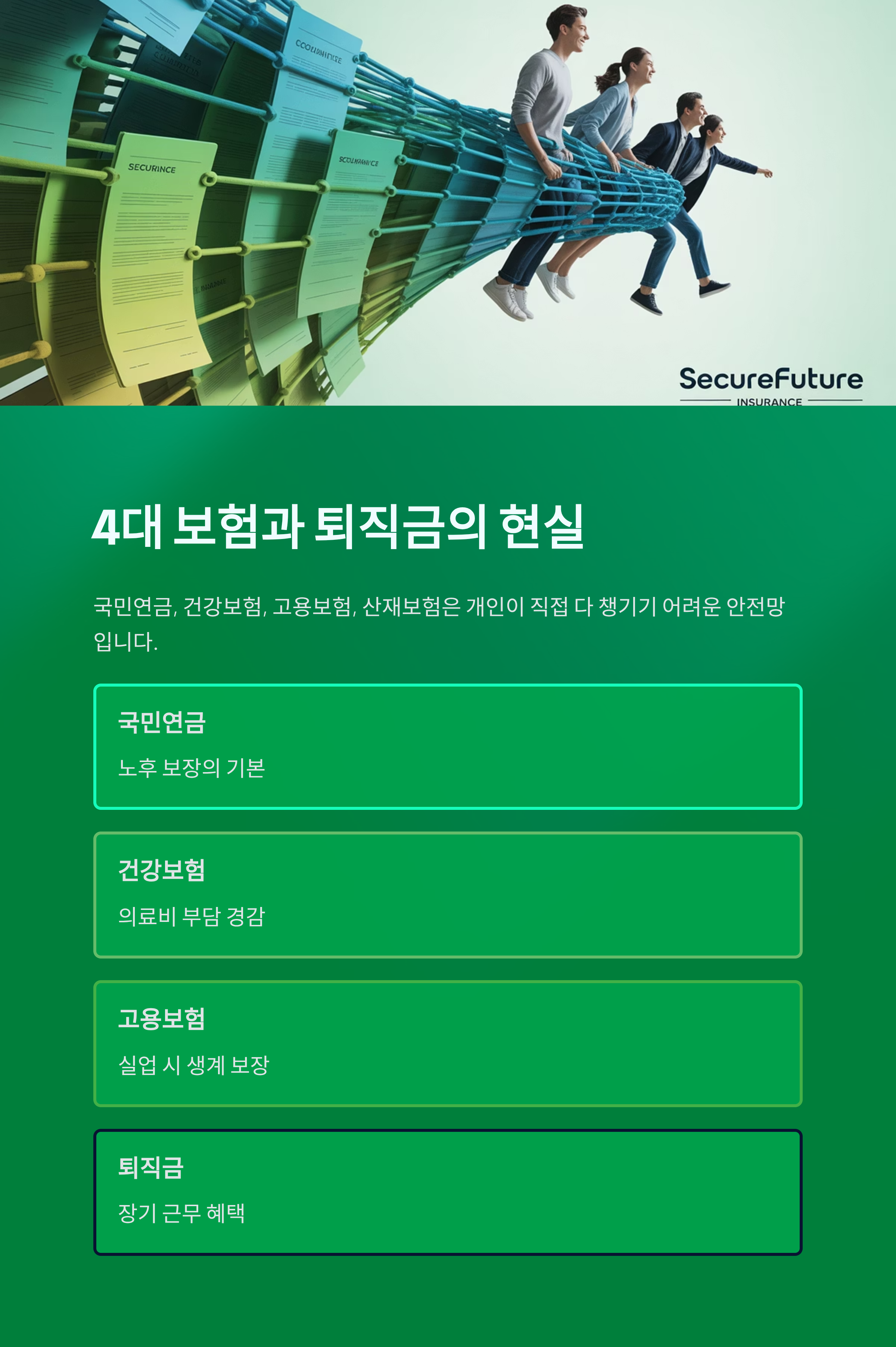 국민연금, 건강보험, 고용보험, 산재보험은 개인이 직접 다 챙기기 어려운 안전망입니다. 직장을 그만두면 이 모든 것을 본인이 책임져야 하고, 장기적으로 퇴직금 같은 혜택도 사라지기 때문에 부담이 커집니다.