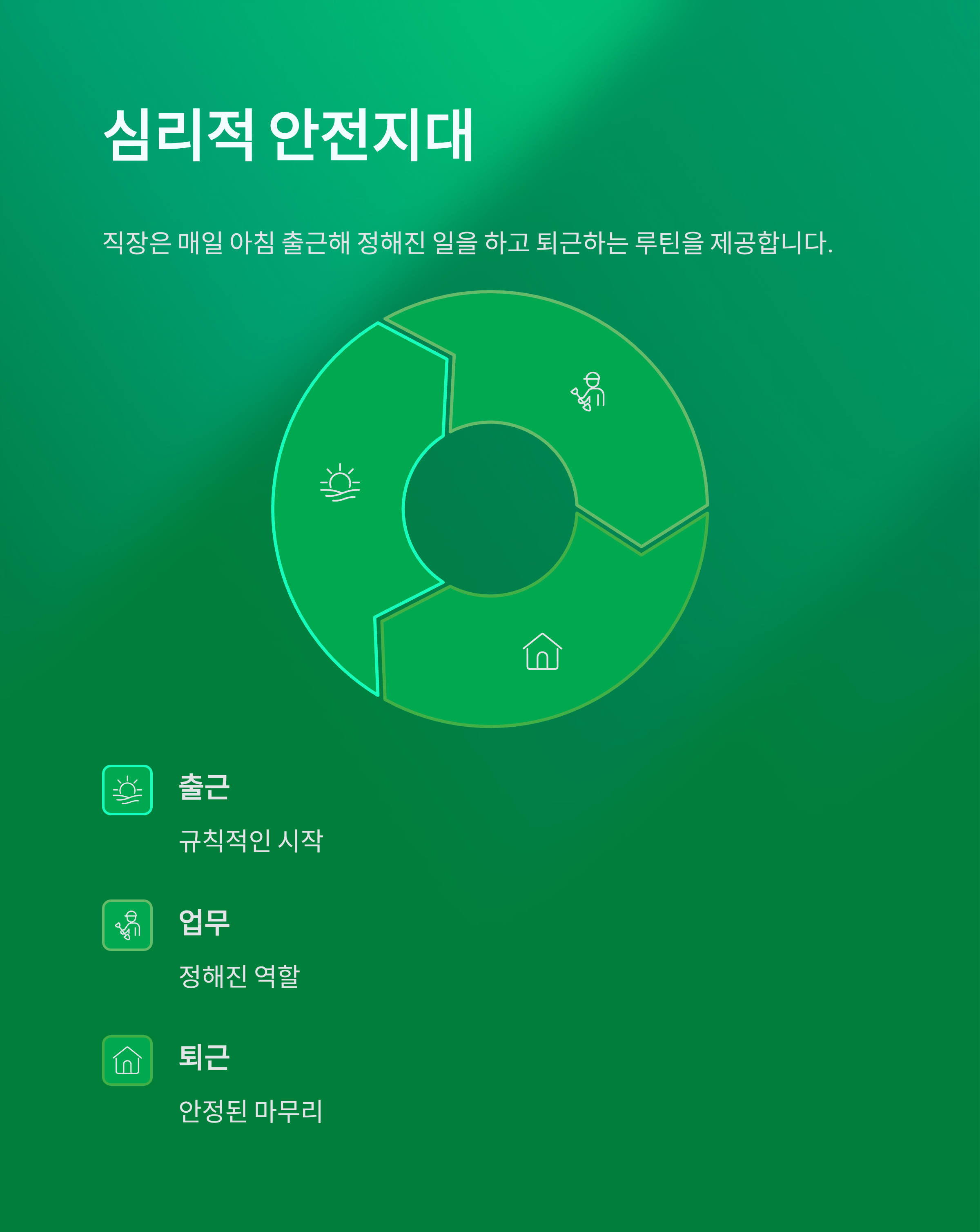 직장은 매일 아침 출근해 정해진 일을 하고 퇴근하는 루틴을 제공합니다. 이 익숙한 생활 패턴이 무너졌을 때 느끼는 공허감과 불안은 생각보다 큽니다. 그래서 많은 이들이 안정된 울타리 안에 머무르려 합니다.