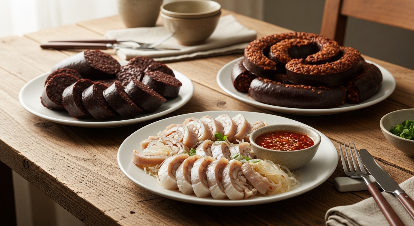 한 접시에 순대, 블랙푸딩, 모르시야를 함께 올리면 서로 다른 풍미가