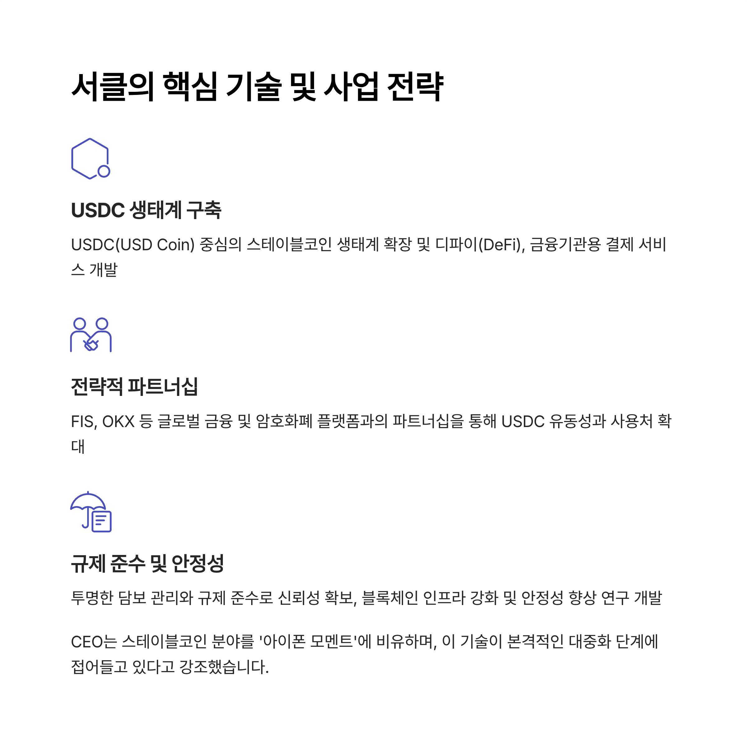 | 핵심 동향 | USDC 시장 확대, 금융기관 파트너십, 규제 대응, 인프라 강화 |