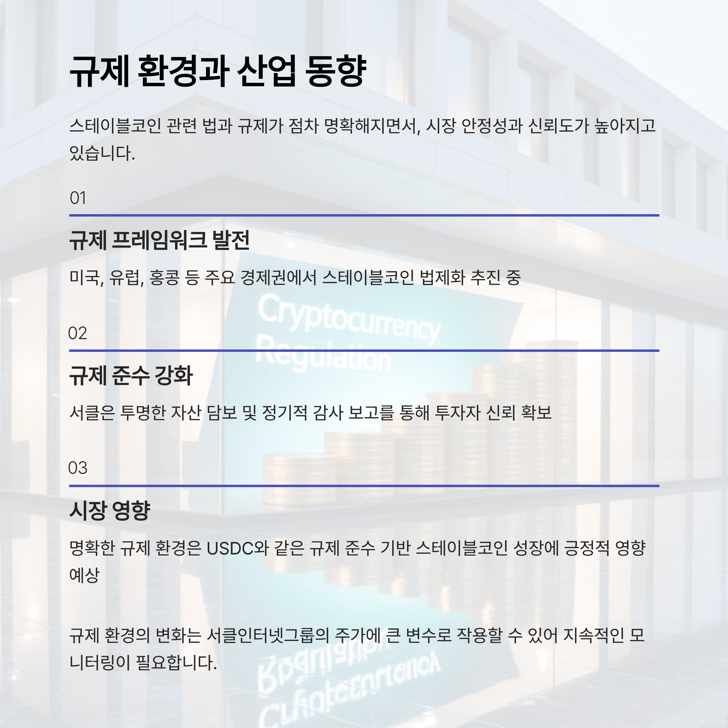 - 미국을 비롯한 주요 국가들이 스테이블코인 법제화를 추진 중이며, 서클은 규제 준수 및 투명한 담보 관리로 신뢰성 확보에 힘쓰고 있습니다.