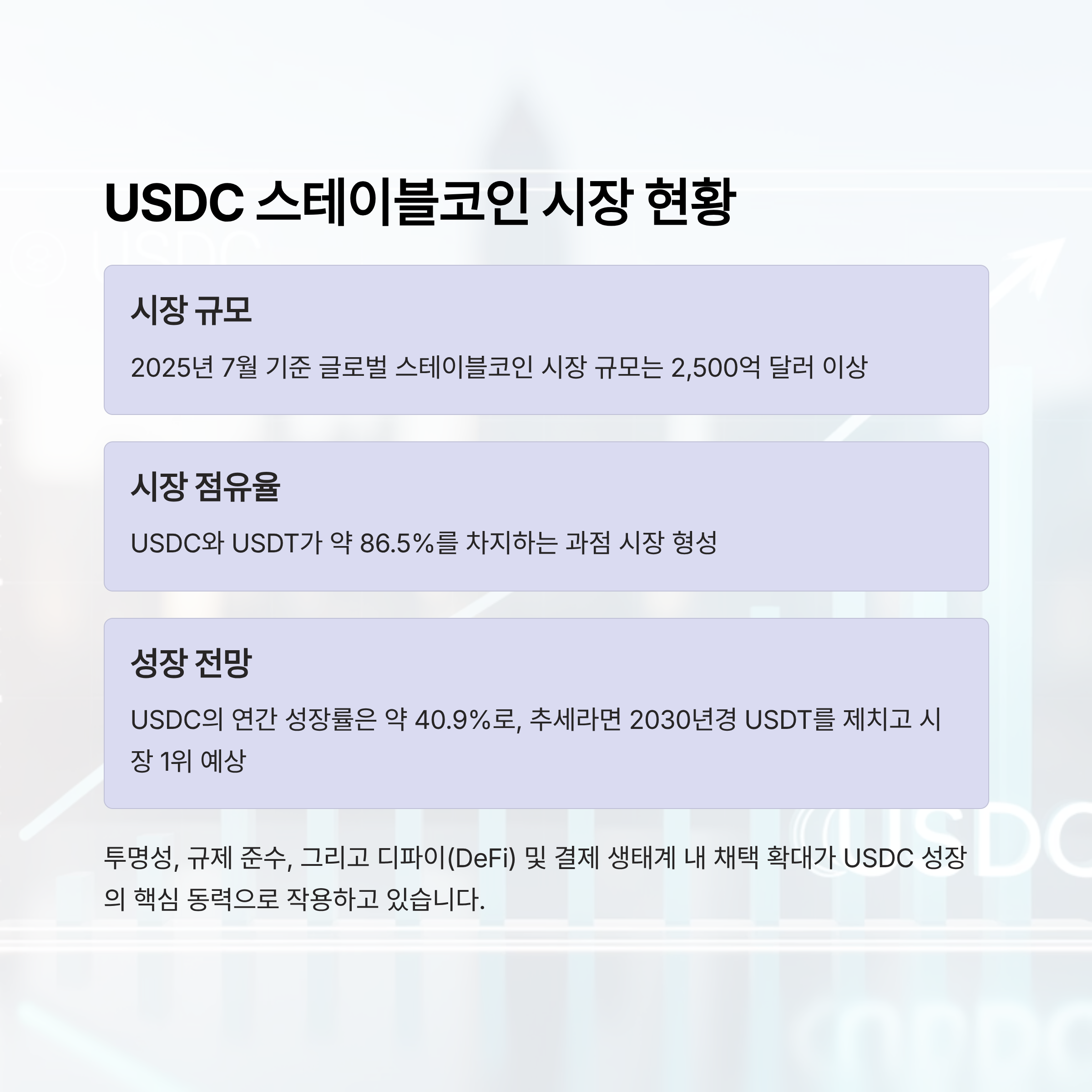 - 투명성, 규제 준수, 광범위한 디파이(DeFi) 및 결제 생태계 내 채택 확대가 USDC 성장의 핵심 동력입니다.