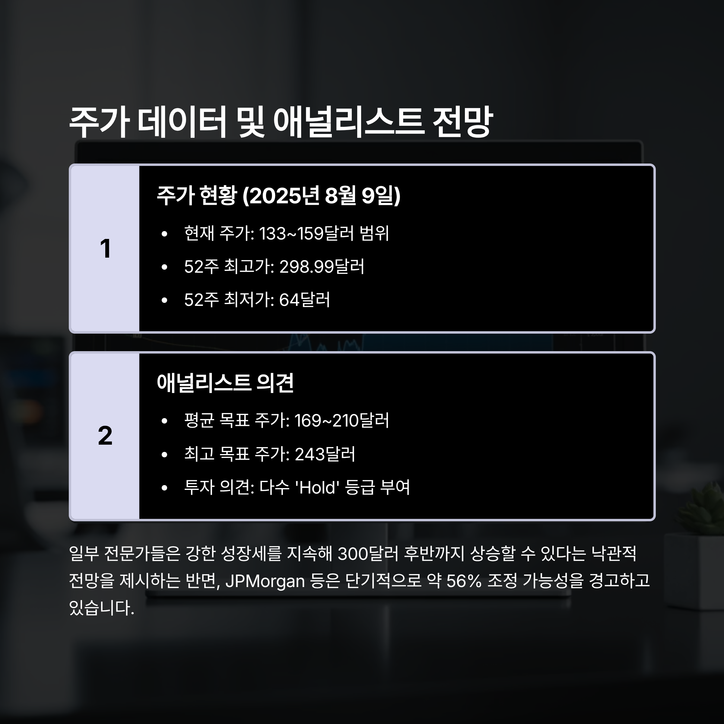 - 주요 증권사 목표 주가: 평균 169~210달러, 최고 243달러까지 전망하는 곳도 있음