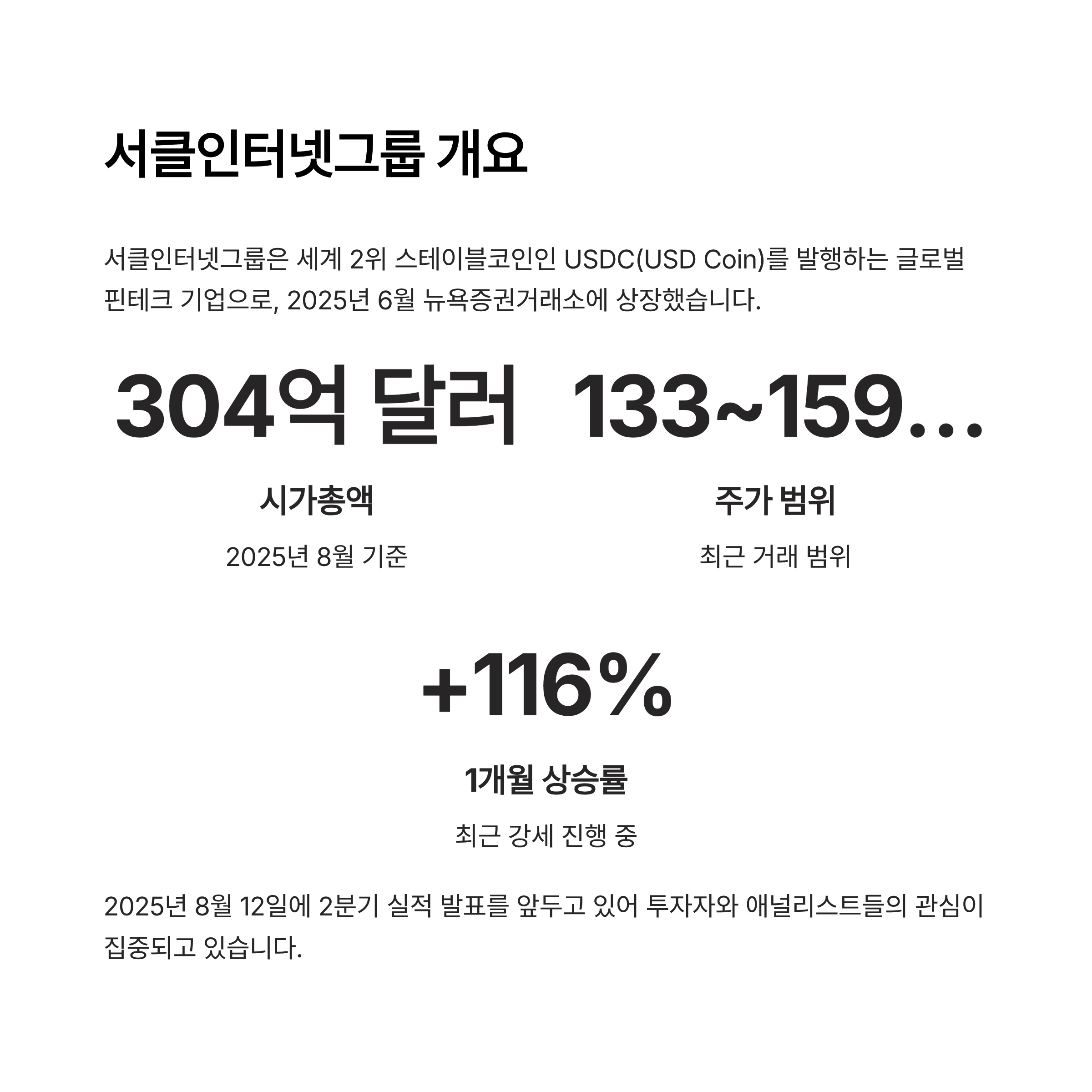 - 서클인터넷그룹은 세계 2위 스테이블코인인 USDC(USD Coin)를 발행하는 글로벌 핀테크 기업으로, 2025년 6월 뉴욕증권거래소에 상장했습니다.