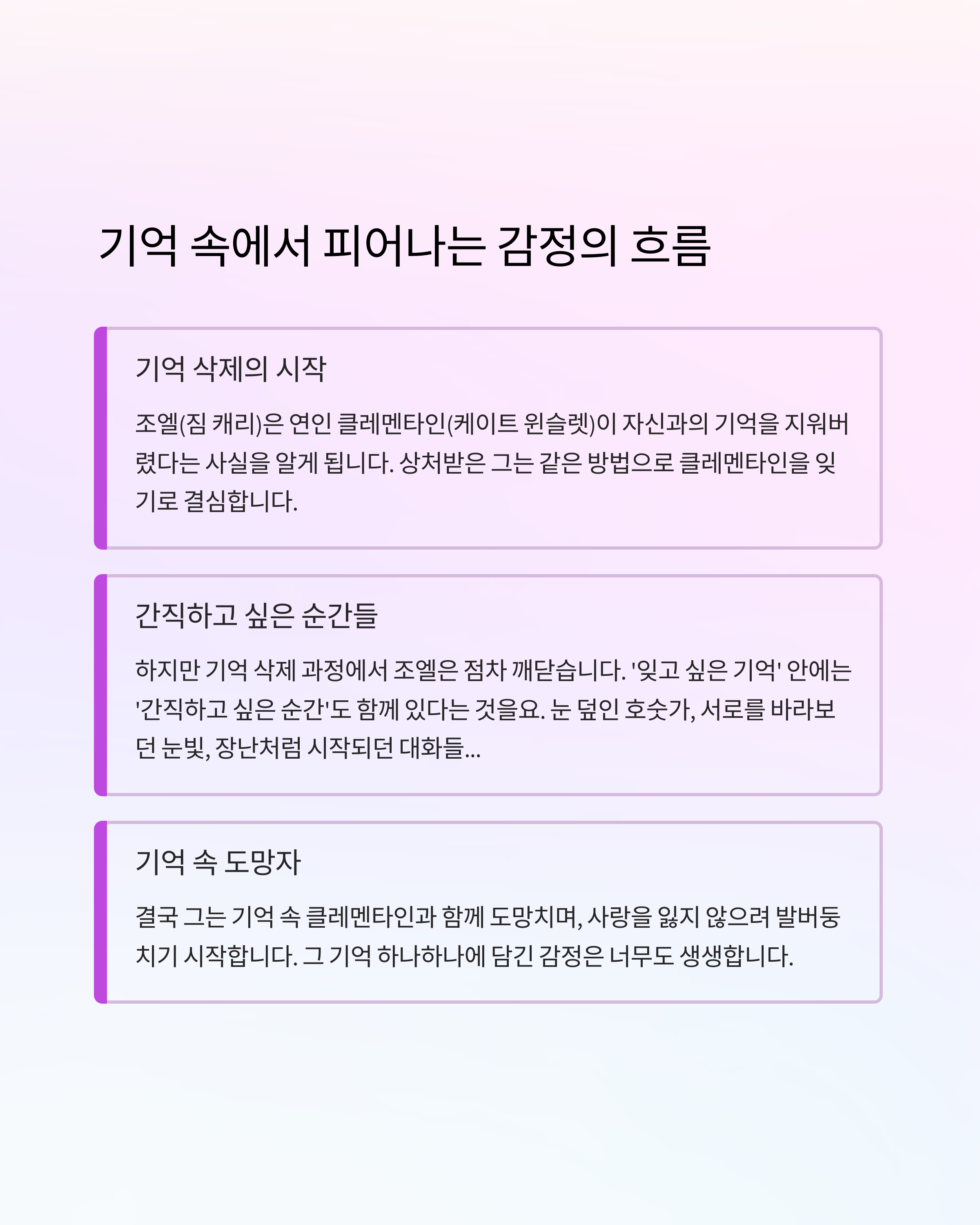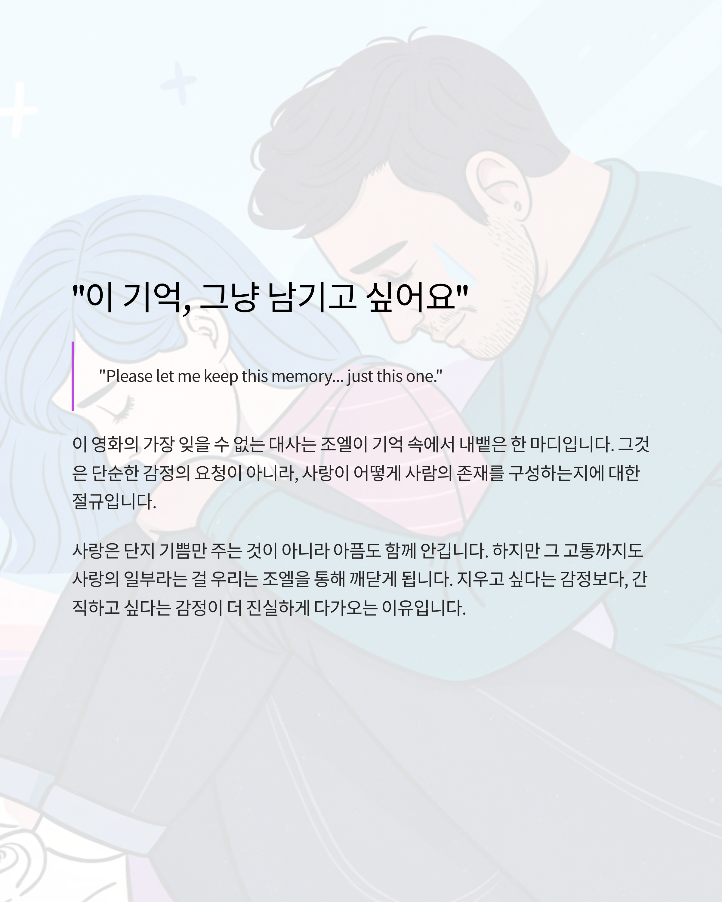 그것은 단순한 감정의 요청이 아니라, 사랑이 어떻게 사람의 존재를 구성하는지에 대한 절규입니다. 사랑은 단지 기쁨만 주는 것이 아니라 아픔도 함께 안깁니다. 하지만 그 고통까지도 사랑의 일부라는 걸 우리는 조엘을 통해 깨닫게 됩니다. 지우고 싶다는 감정보다, 간직하고 싶다는 감정이 더 진실하게 다가오는 이유입니다.