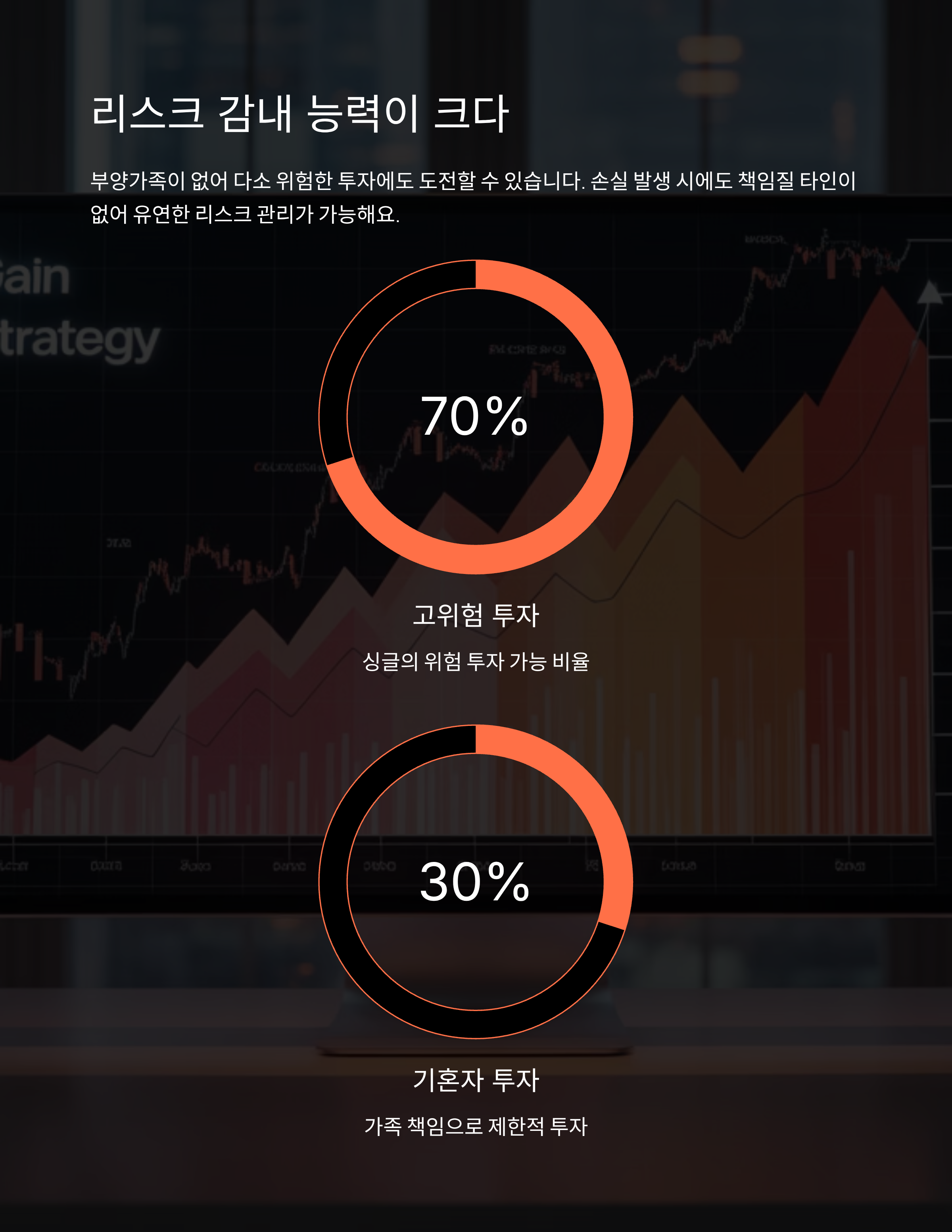 싱글은 부양가족이 없기 때문에 다소 위험한 투자에도 도전할 수 있습니다. 손실이 발생하더라도 책임져야 할 타인이 없으니 리스크 관리가 상대적으로 유연합니다.