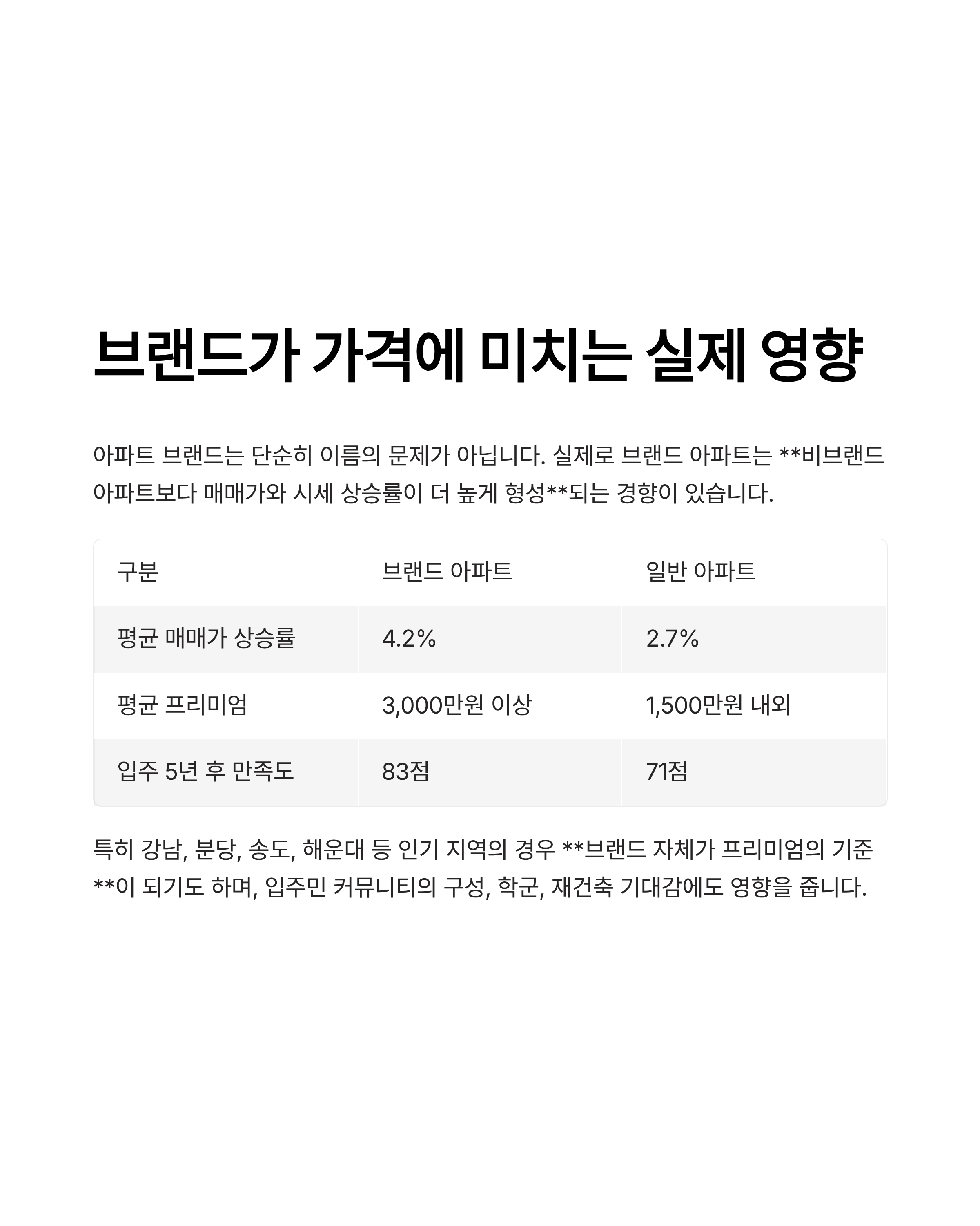 구분 브랜드 아파트 일반 아파트 평균 매매가 상승률 4.2% 2.7% 평균 프리미엄 3,000만원 이상 1,500만원 내외 입주 5년 후 만족도 83점 71점